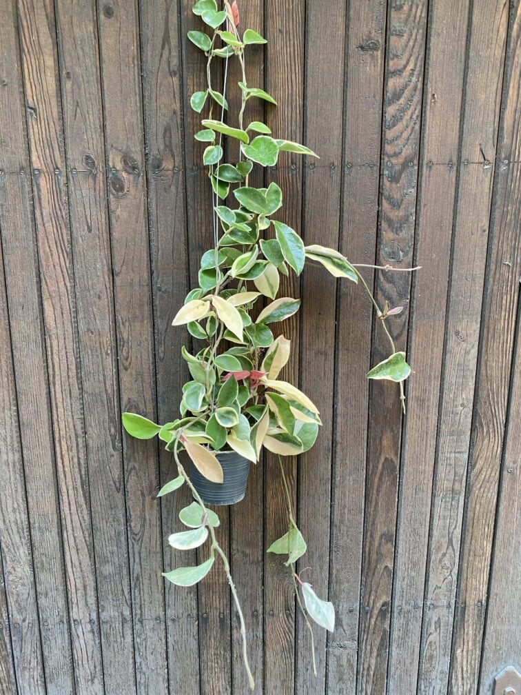 Widoczna na zdjęciu roślina: Hoya carnosa albomarginata ma wysokość około 70 cm. Jej doniczka ma 10 cm średnicy oraz 12 cm wysokości.