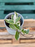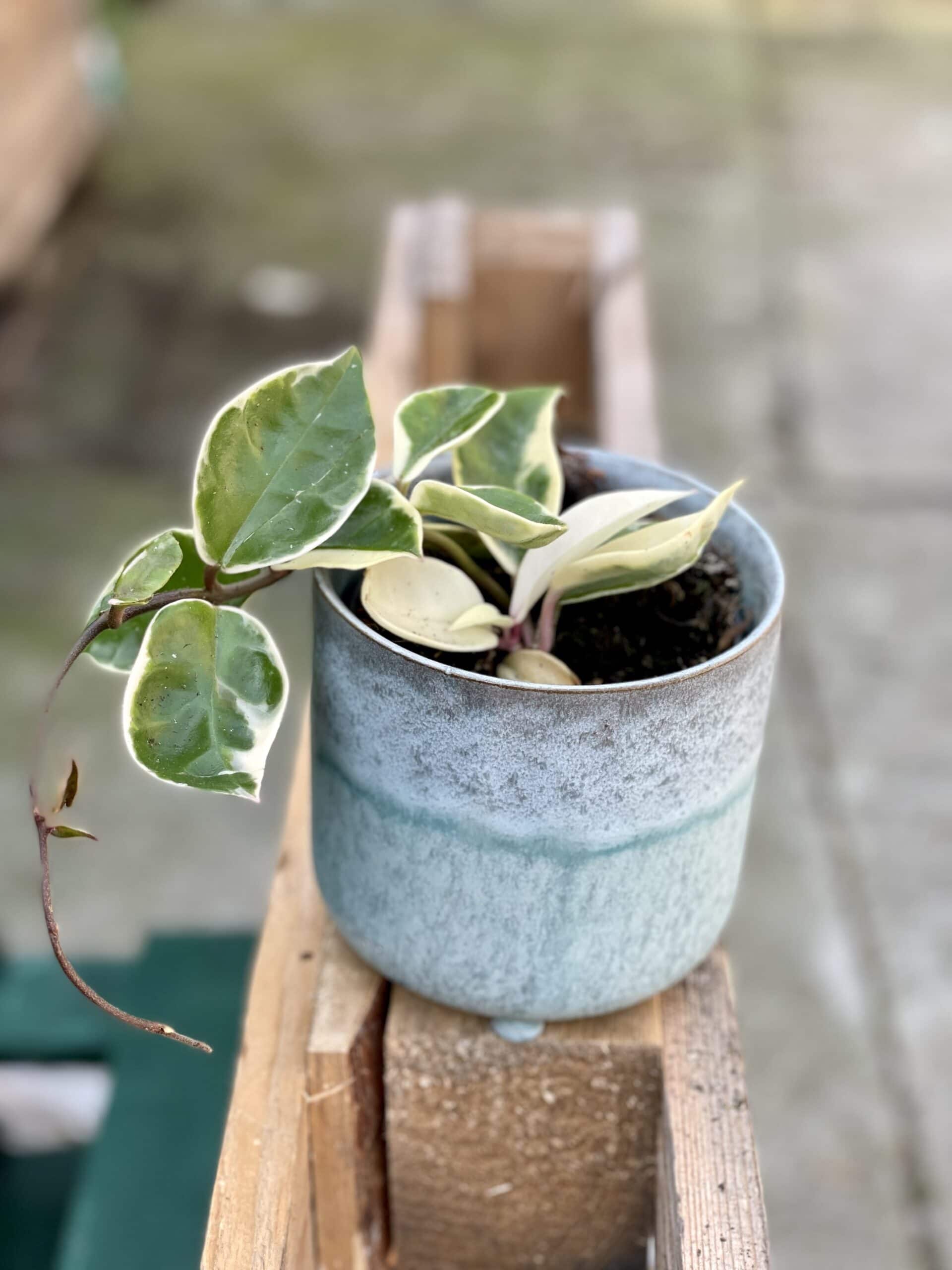 Widoczna na zdjęciu roślina: Hoya carnosa albomarginata ma wysokość około 15 cm. Jej doniczka ma 11 cm średnicy oraz 9 cm wysokości.