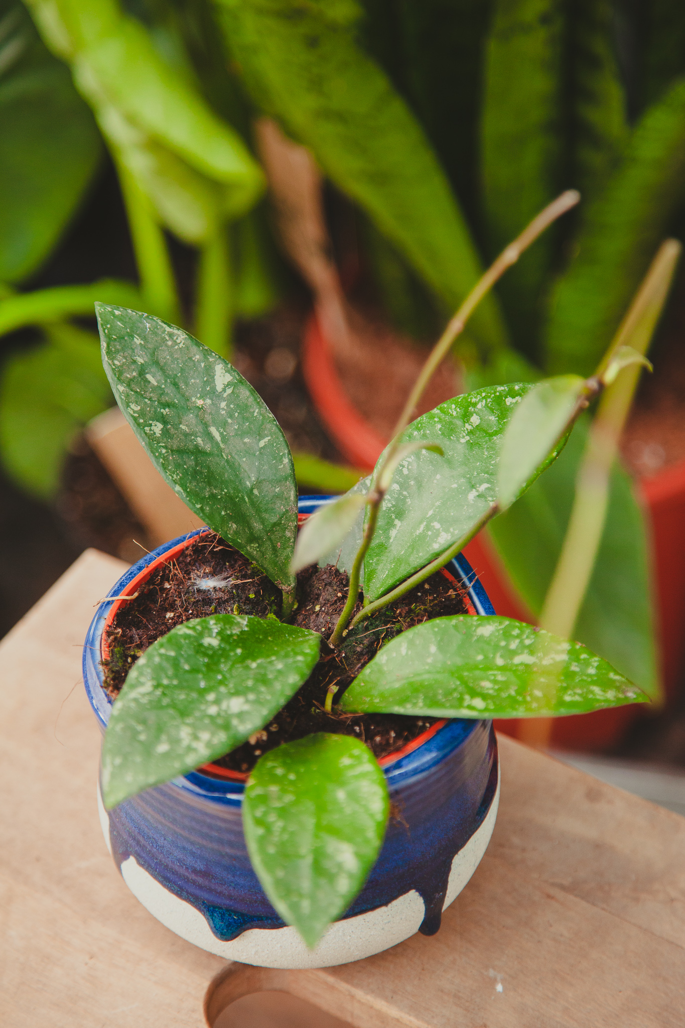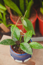 Hoya o mięsistych, owalnych liściach pokrytych nieregularnym, srebrzystym splashem. Ma piękny, kaskadowy pokrój i zakwita wonnymi baldachami gwiazdkowatych kwiatów.