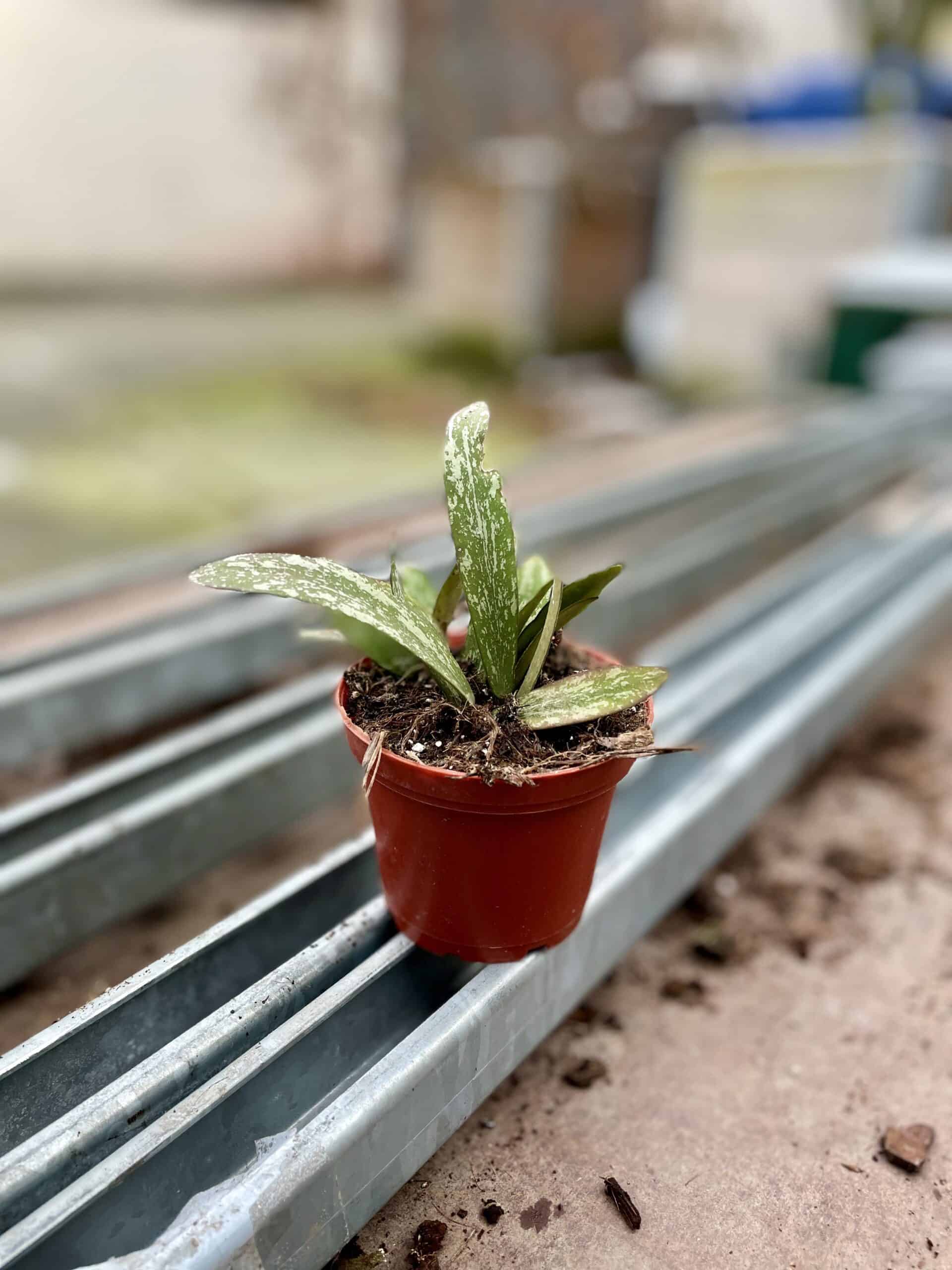 Hoya Sigillatis to woskownica o podłużnych, bogato nakrapianych splashem liściach. Pod wpływem słońca jest podatna na zjawisko “sun stress” – jej liście nabierają bordowego rumieńca. W naturze to hoja endemiczna dla Borneo. Zakwita pomarańczowymi kwiatkami, które podobno pachną karmelem!