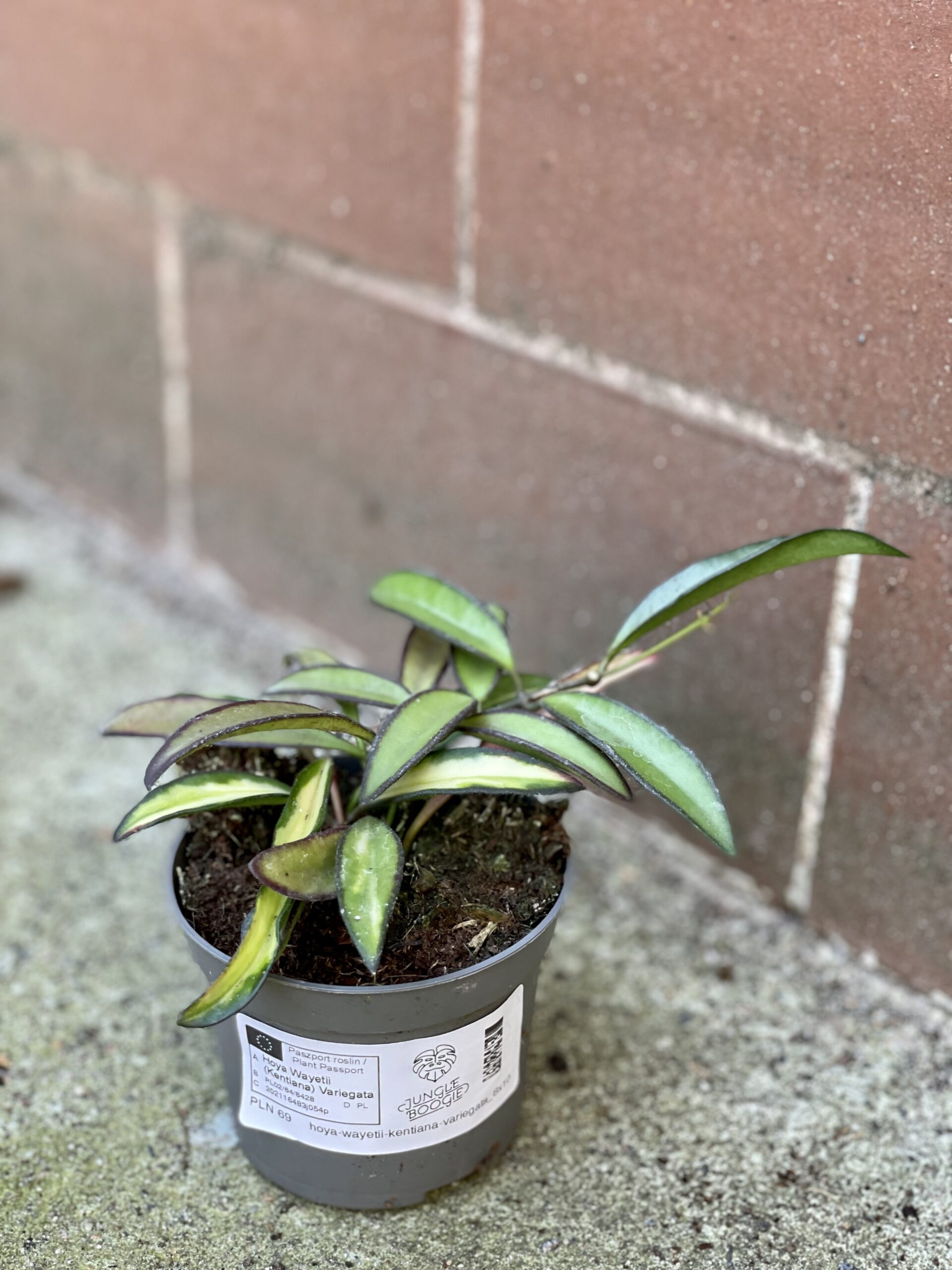 Widoczna na zdjęciu roślina: Hoya wayetii (kentiana) variegata ma wysokość około 10 cm. Jej doniczka ma 8 cm średnicy oraz 7 cm wysokości.