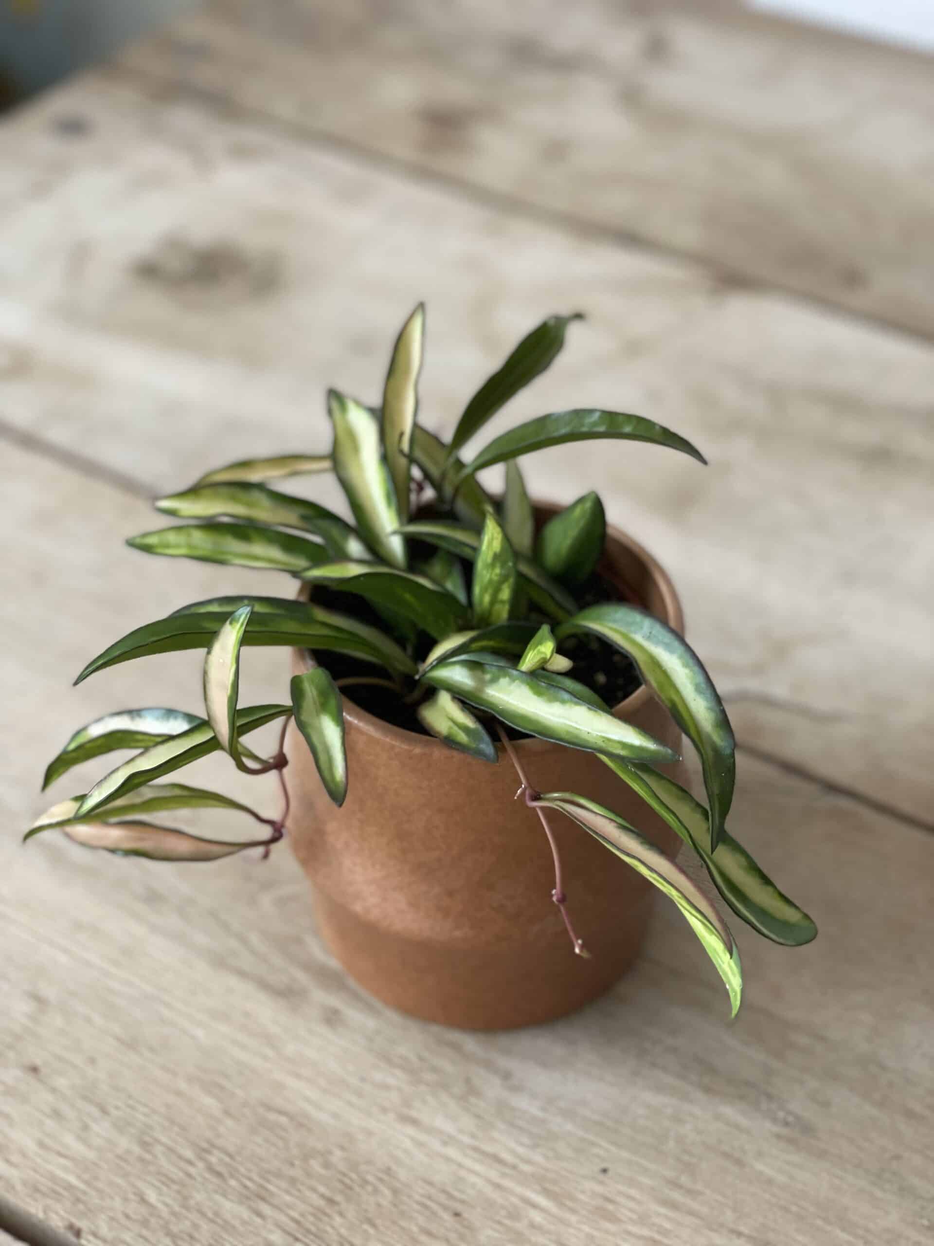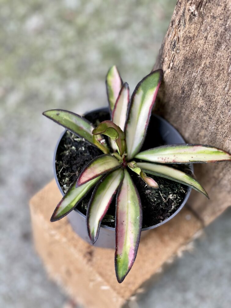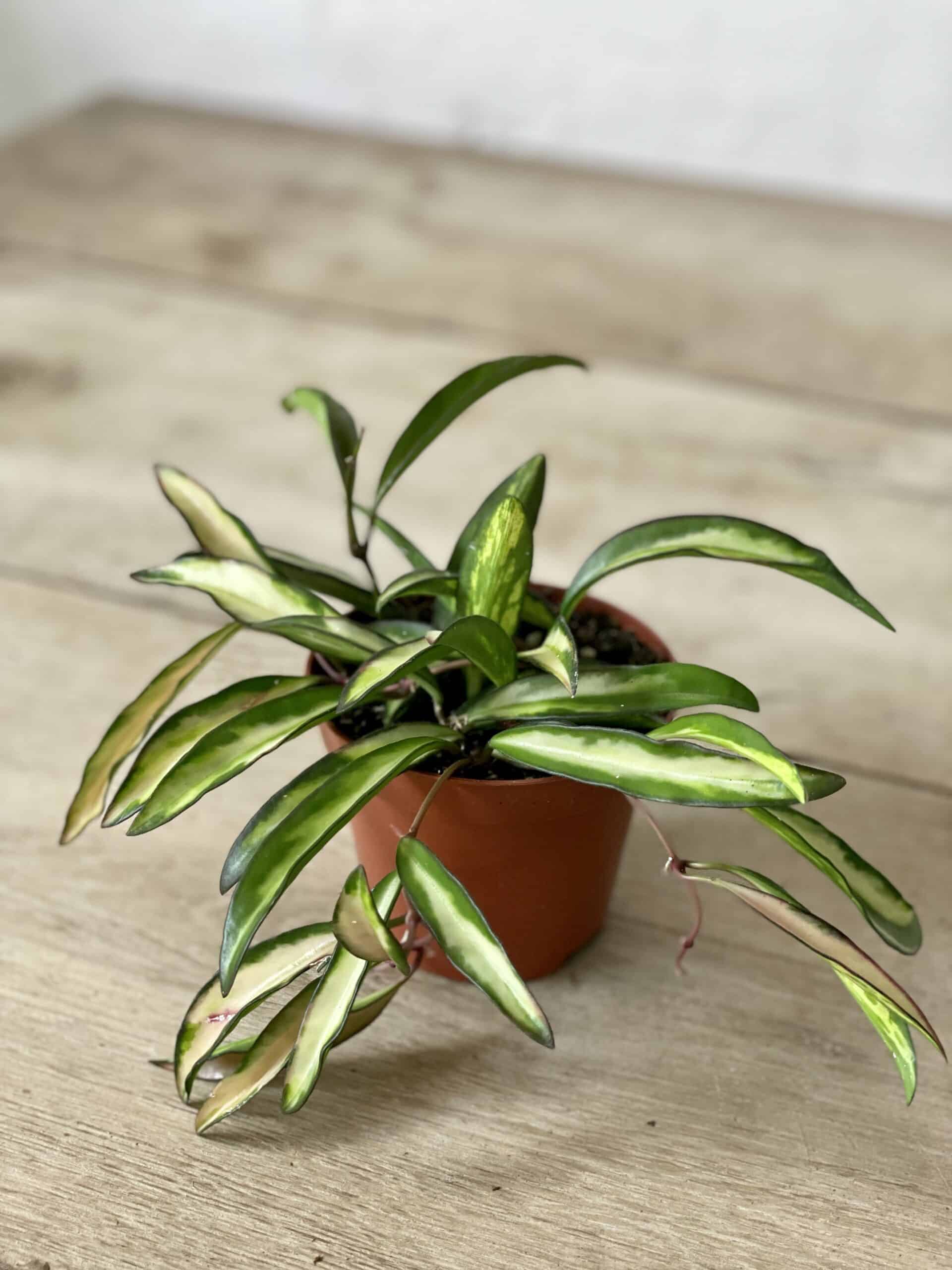 Hoya wayetii (kentiana) variegata to kolekcjonerska odmiana hoi, o wyjątkowych wydłużonych liściach, z ciemniejszym obramowaniem. Nowe liście tej woskownicy mają uroczą różową barwę, która z czasem przechodzi w bardziej kremowy odcień. Jak wszystkie woskownice – za dobrą opiekę odwdzięcza się pięknymi kwiatami.