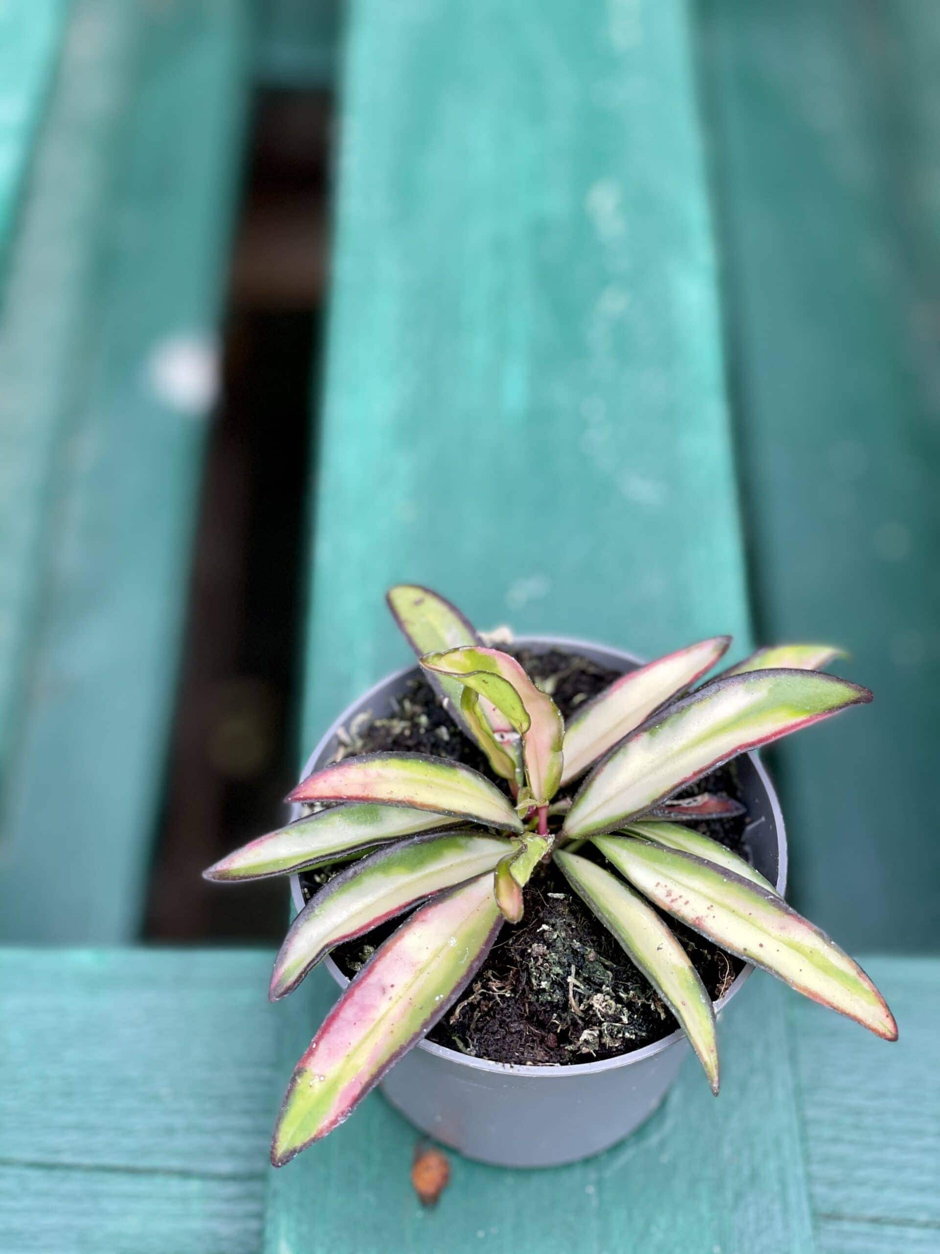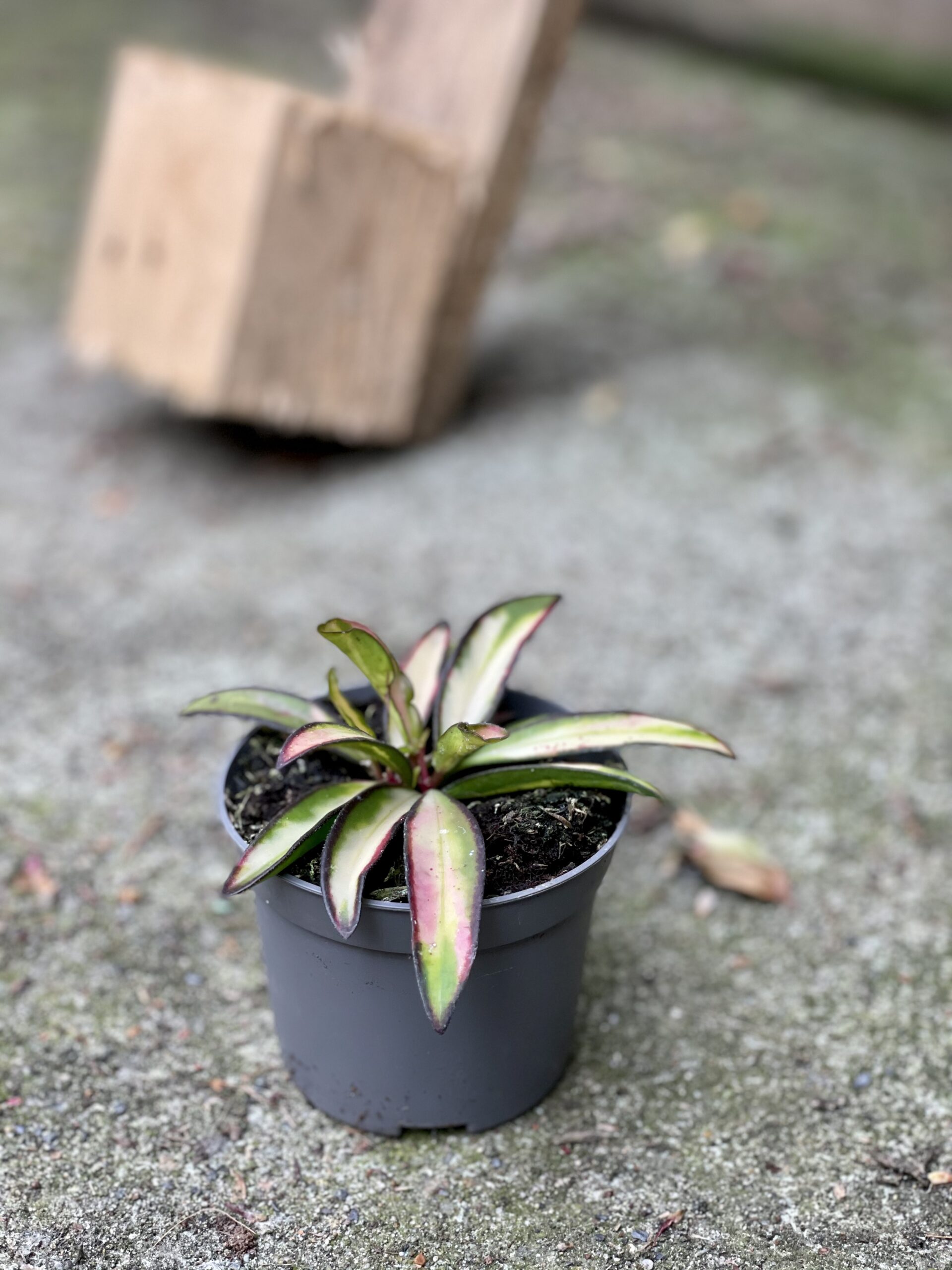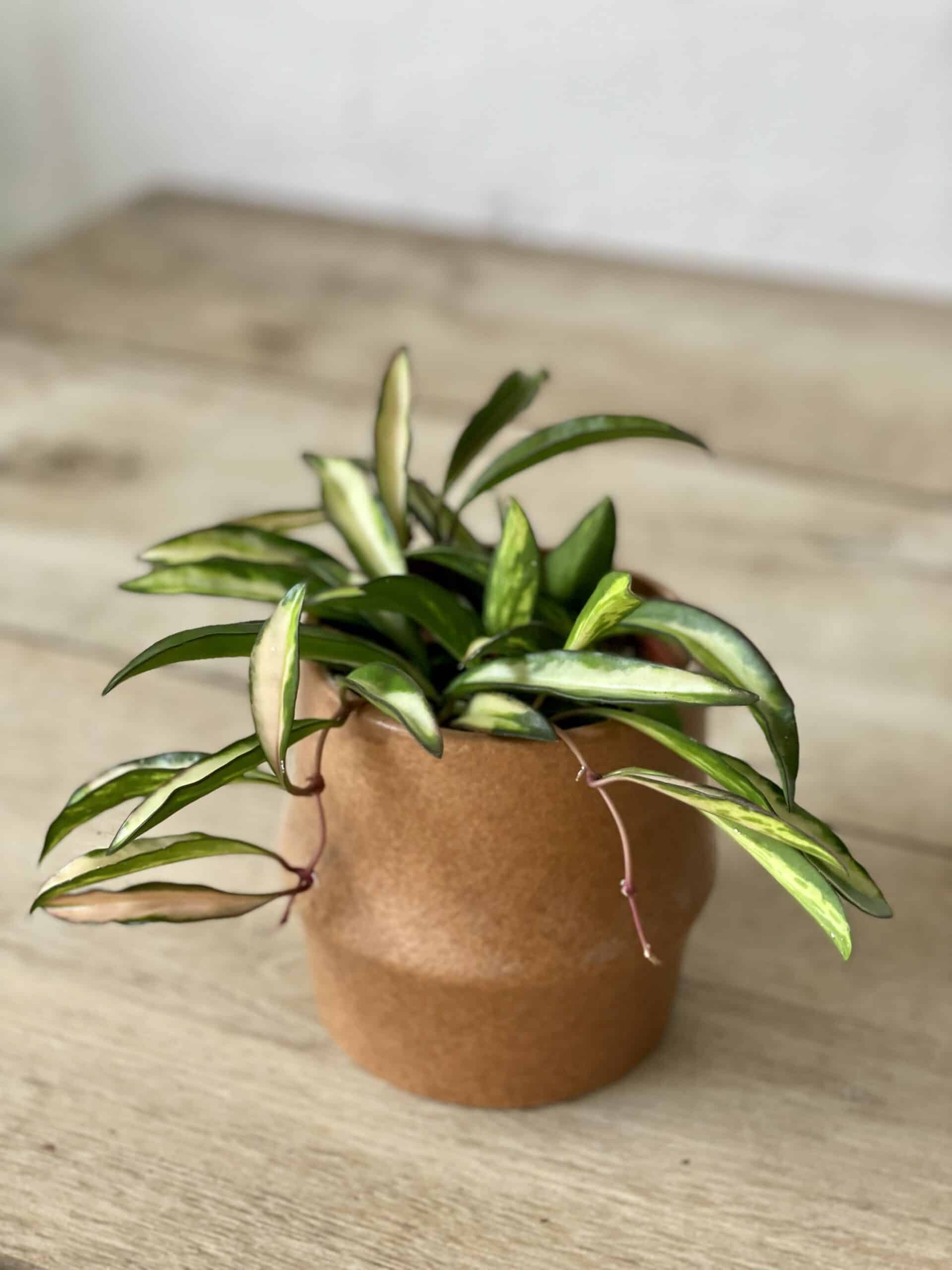 Hoya wayetii (kentiana) variegata to kolekcjonerska odmiana hoi, o wyjątkowych wydłużonych liściach, z ciemniejszym obramowaniem. Nowe liście tej woskownicy mają uroczą różową barwę, która z czasem przechodzi w bardziej kremowy odcień. Jak wszystkie woskownice – za dobrą opiekę odwdzięcza się pięknymi kwiatami.