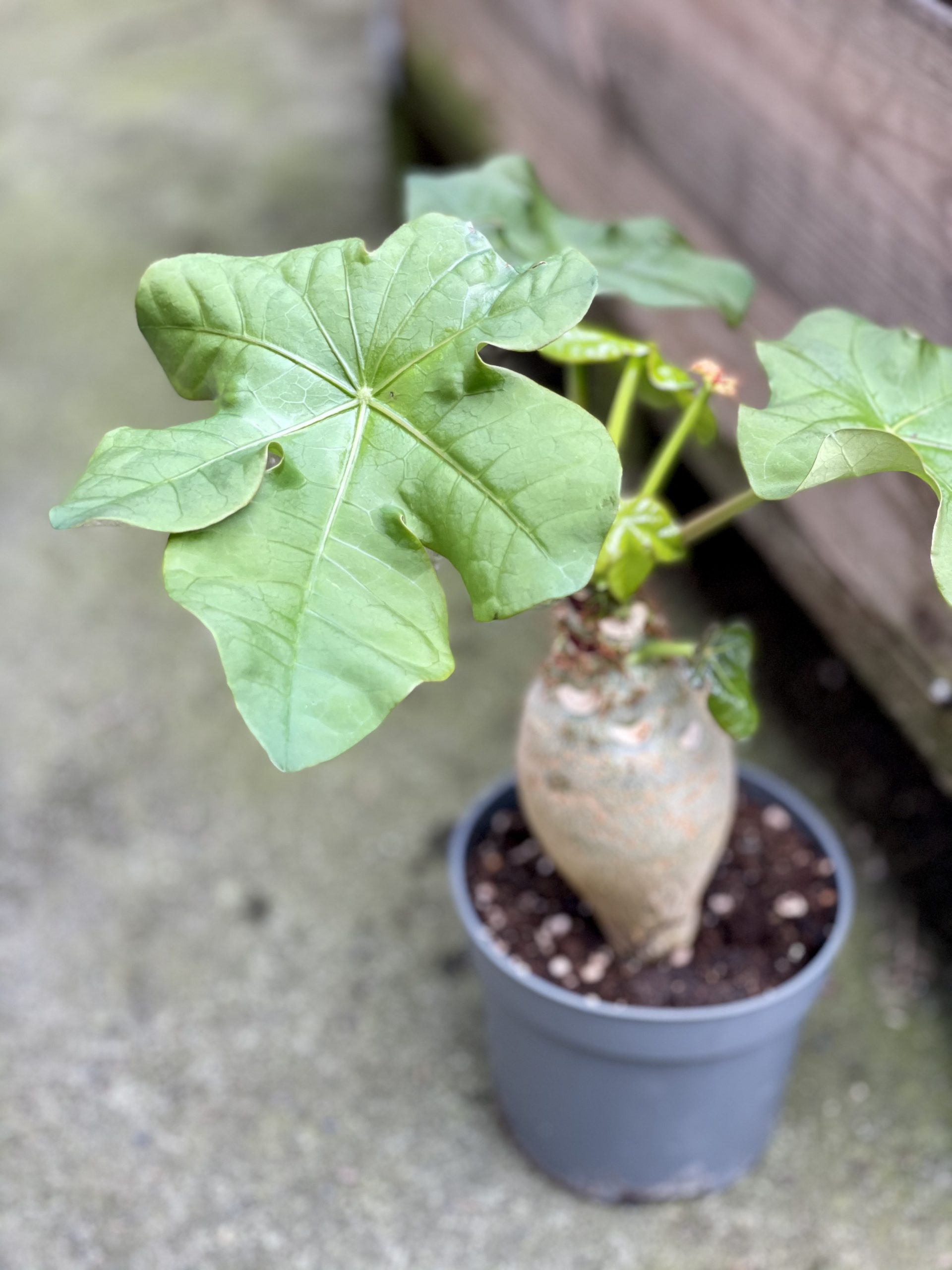 Jatropha podagrica (Jatrofa podagriowata) to ciekawy sukulent przypominający małe drzewko ozdobione kilkoma dużymi, zielonymi liśćmi. W łodydze przypominającej pień gromadzi wodzę, dzięki czemu jest odporny na przesuszenie.