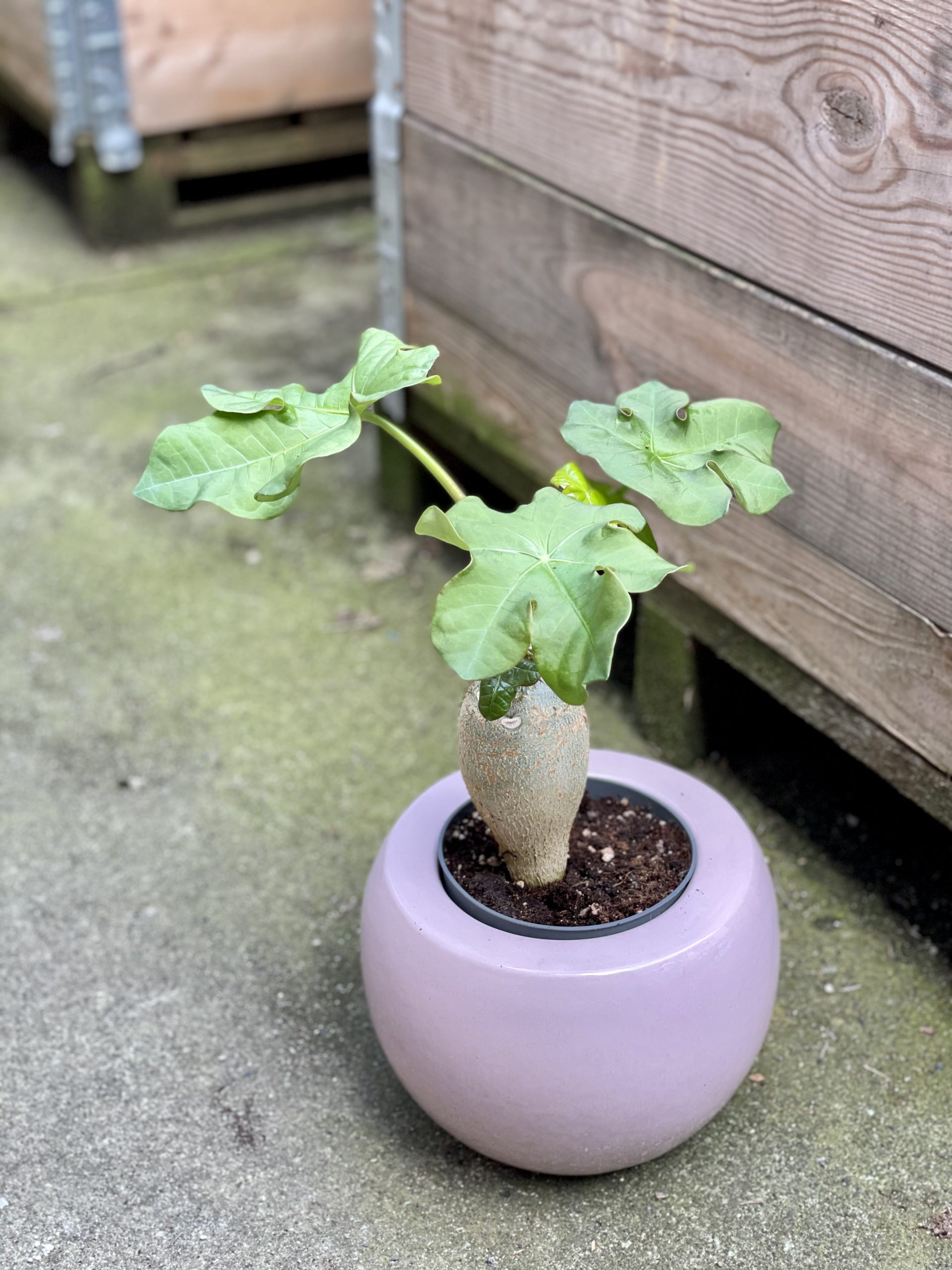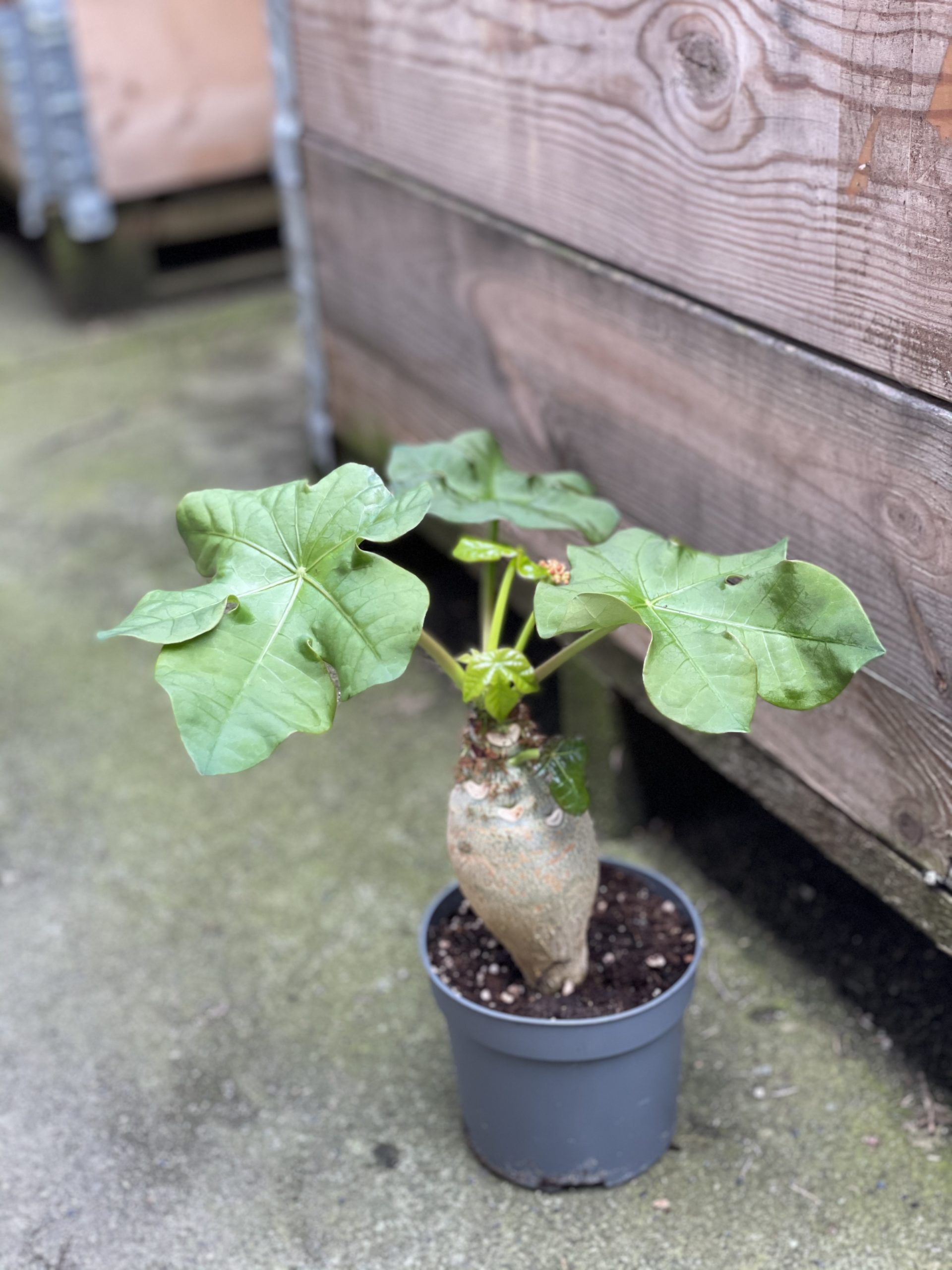 Widoczna na zdjęciu roślina: Jatropha podagrica (Jatrofa podagriowata) ma wysokość około 30 cm. Jej doniczka ma 13 cm średnicy oraz 10 cm wysokości.