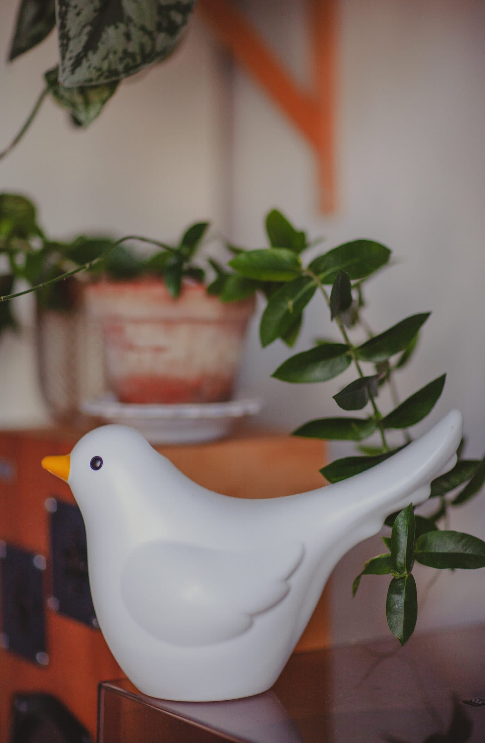 Urocza, plastikowa konewka w kształcie ptaka! W dziobie znajduje się otwór, z którego wylewa się woda podczas podlewania, a na głowie – otwór do napełniania konewki. Ogon ptaka służy za rączkę. Czy to nie brzmi super?:) To idealna konewka do podlewania zarówno domowych roślin, jak i tych uprawianych na zewnątrz. Nasza gołębia konewka ma pojemność 1,5l.