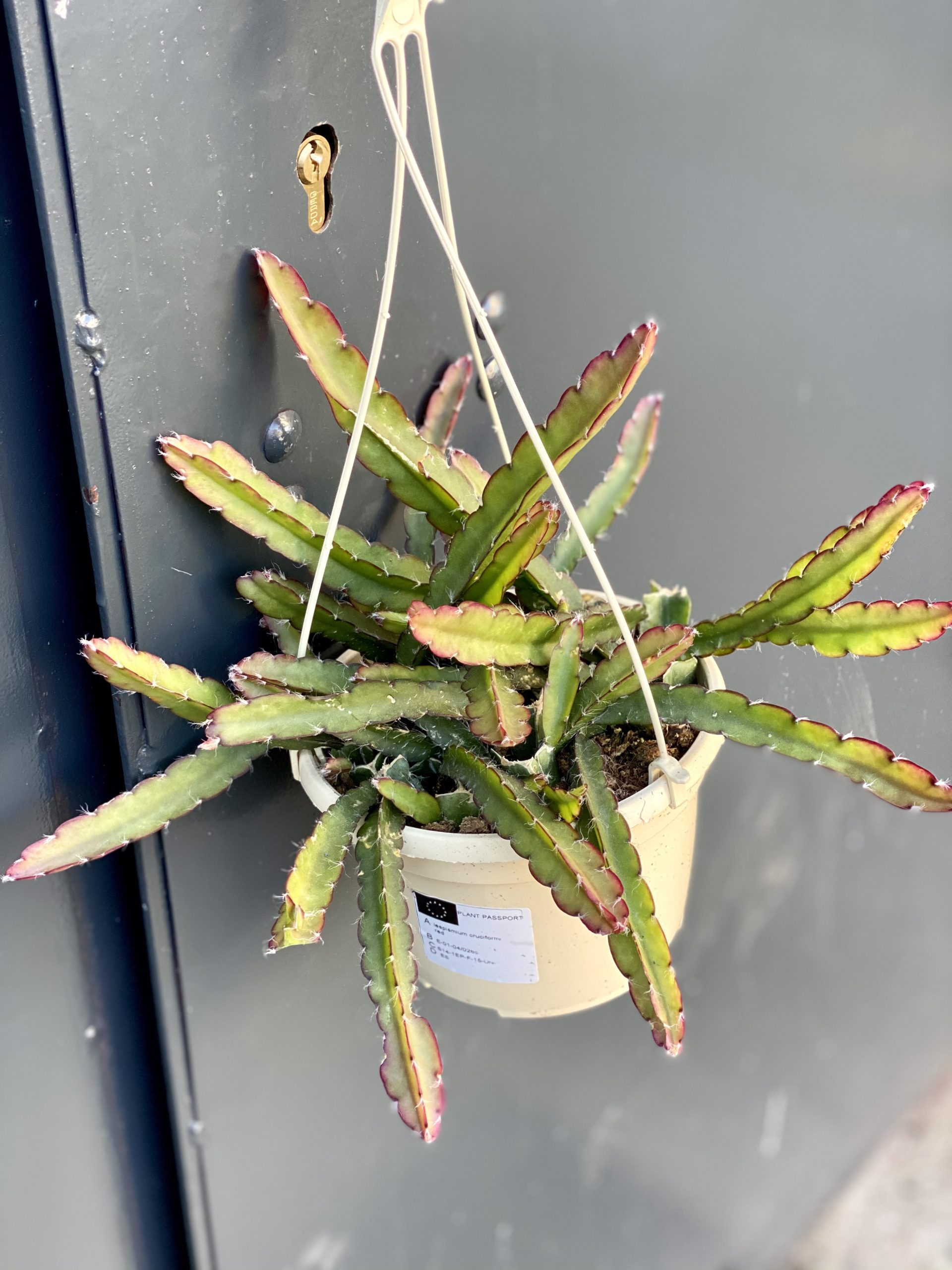 Lepismium cruciforme to przykuwające wzrok lepismium o długich mięsistych pędach z białymi wypustkami. Pod wpływem słońca może zmienić kolor na delikatnie rdzawy. Okaz zdecydowanie do solidnego zawieszenia, z uwagi na ciężar i długość pędów.