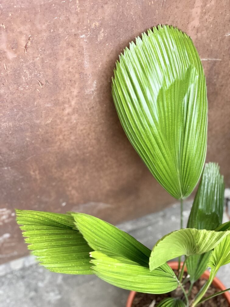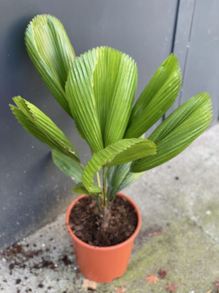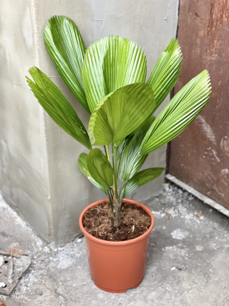 Widoczna na zdjęciu roślina: Licuala Grandis ma wysokość około 80 cm. Jej doniczka ma 24 cm średnicy oraz 22 cm wysokości.