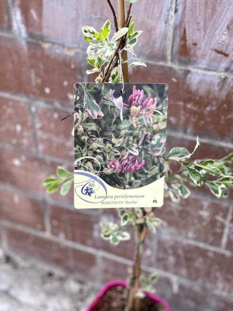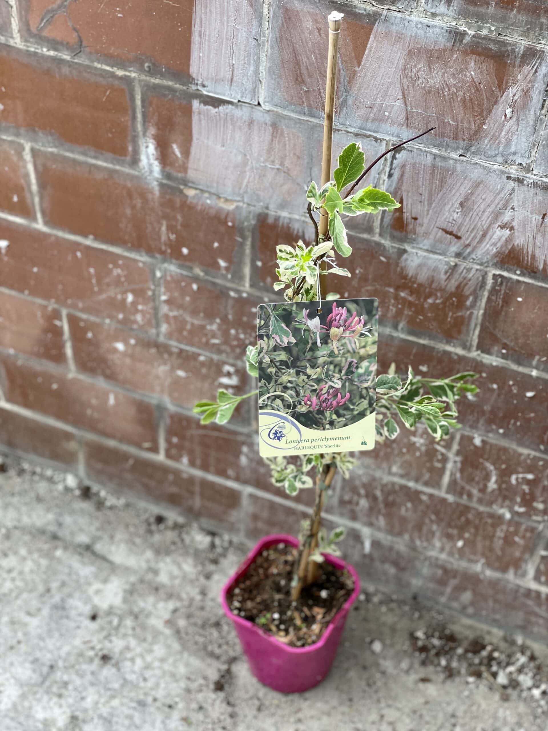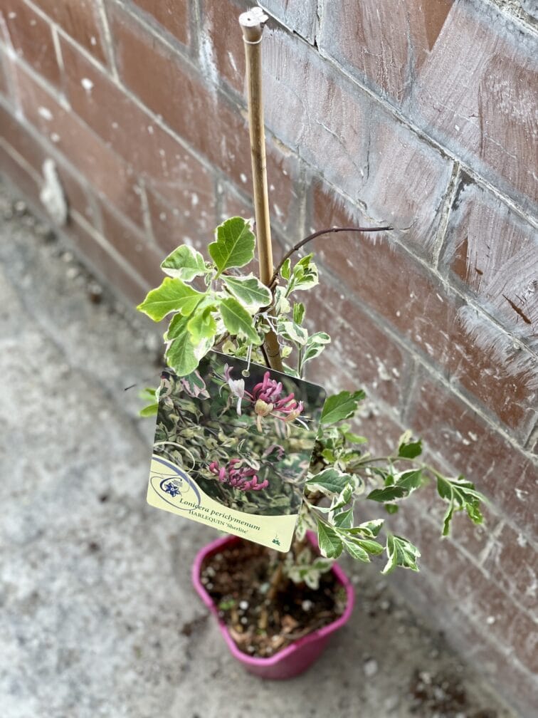 Widoczna na zdjęciu roślina: Lonicera periclymenum Herlequin Sherlite ma wysokość około 70 cm. Jej doniczka ma 17 cm średnicy oraz 15 cm wysokości.
