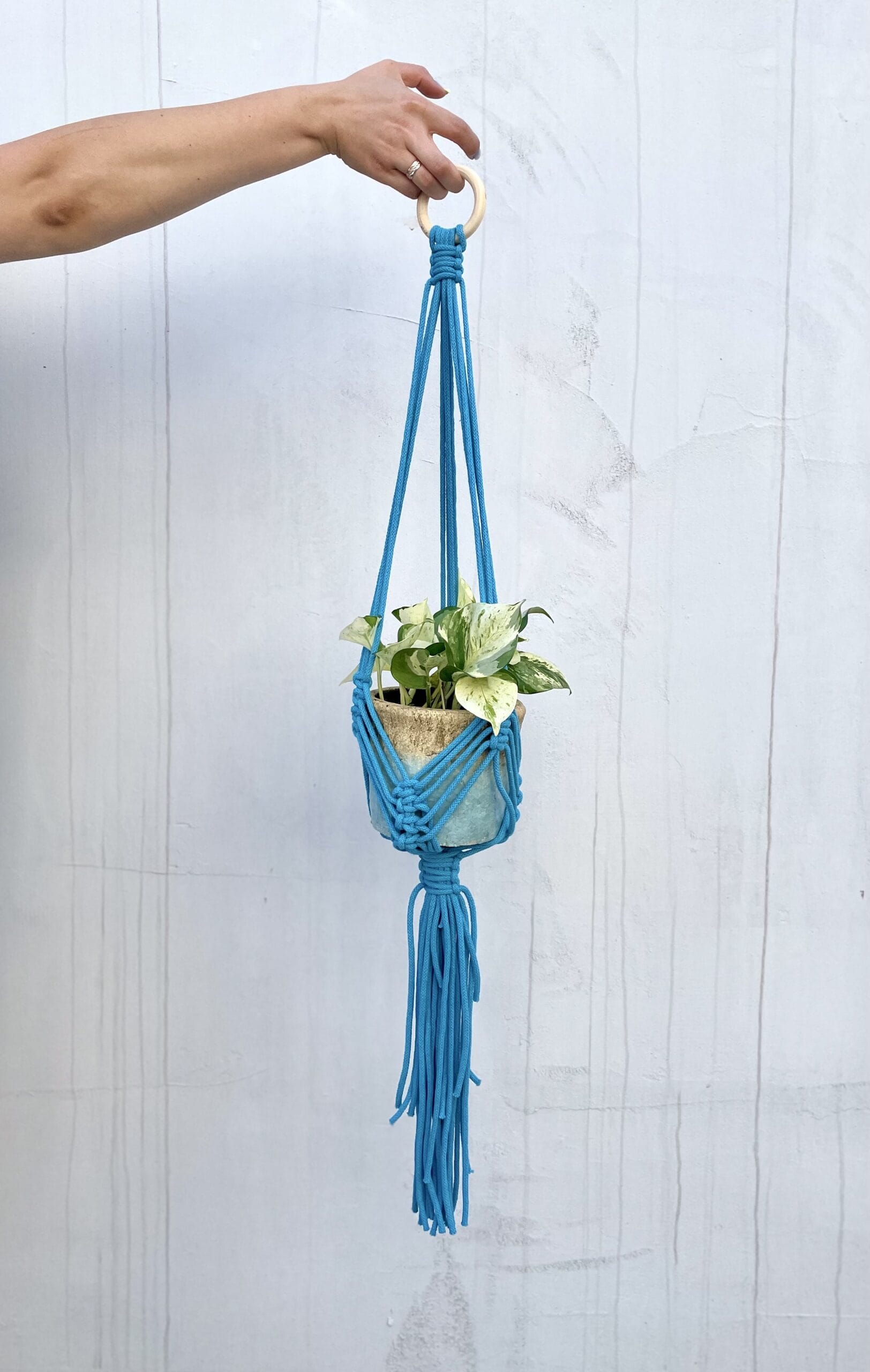 Niebieska, ręcznie pleciona makrama! Kwietnik makramowy to idealna ozdoba do wnętrz w klimacie boho, ale również do tych bardziej klasycznych. Idealnie skomponuje się zwłaszcza z pnączami i wszelkimi roślinami wiszącymi.
