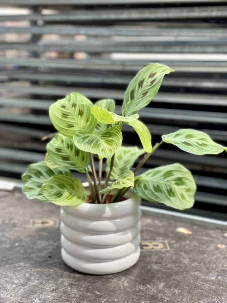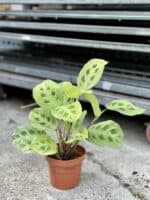 Widoczna na zdjęciu roślina: Maranta Light Veins ma wysokość około 35 cm. Jej doniczka ma 12 cm średnicy oraz 10 cm wysokości.