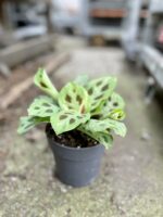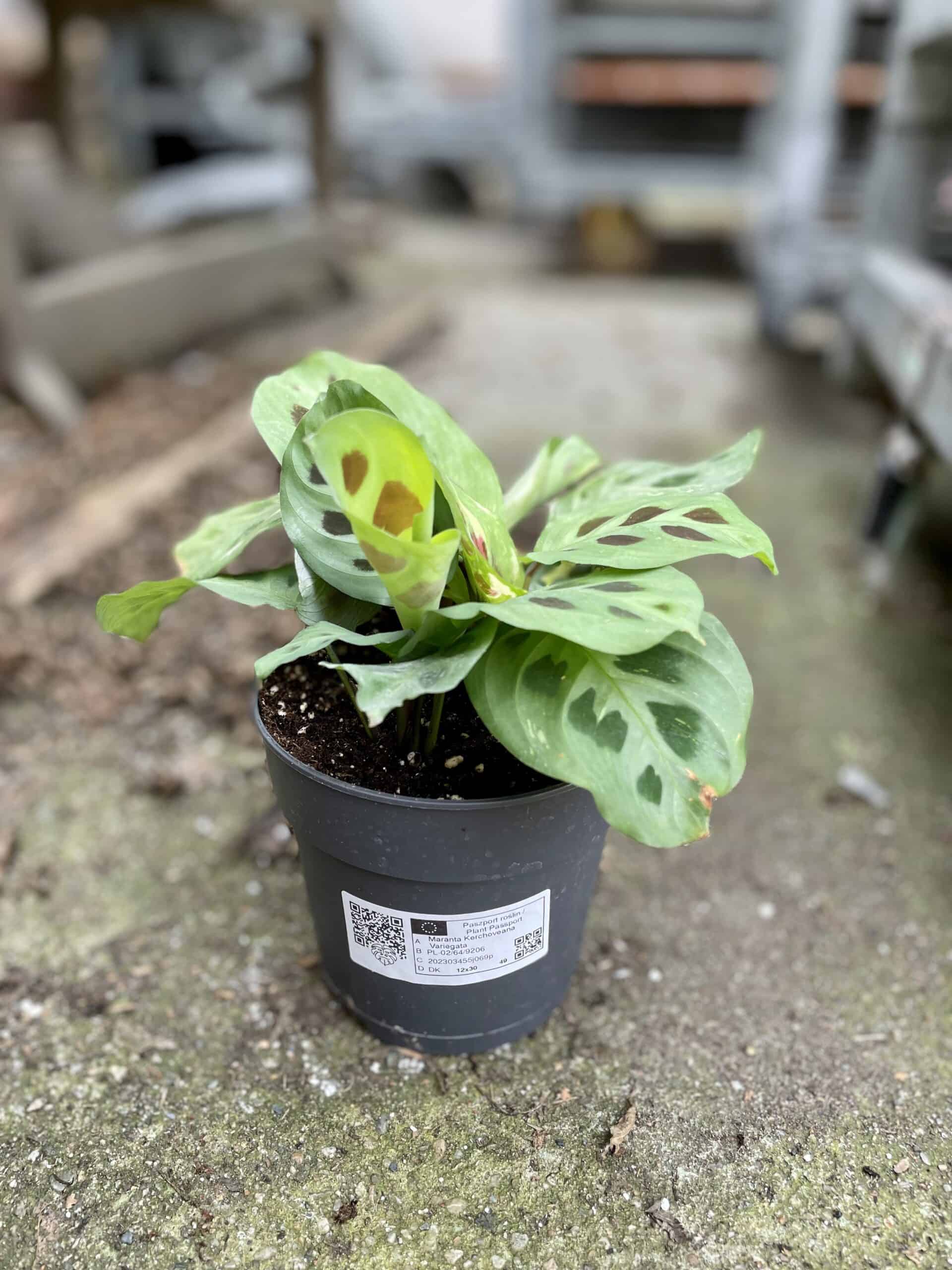 Widoczna na zdjęciu roślina: Maranta Kerchoveana Variegata ma wysokość około 30 cm. Jej doniczka ma 12 cm średnicy oraz 10 cm wysokości.