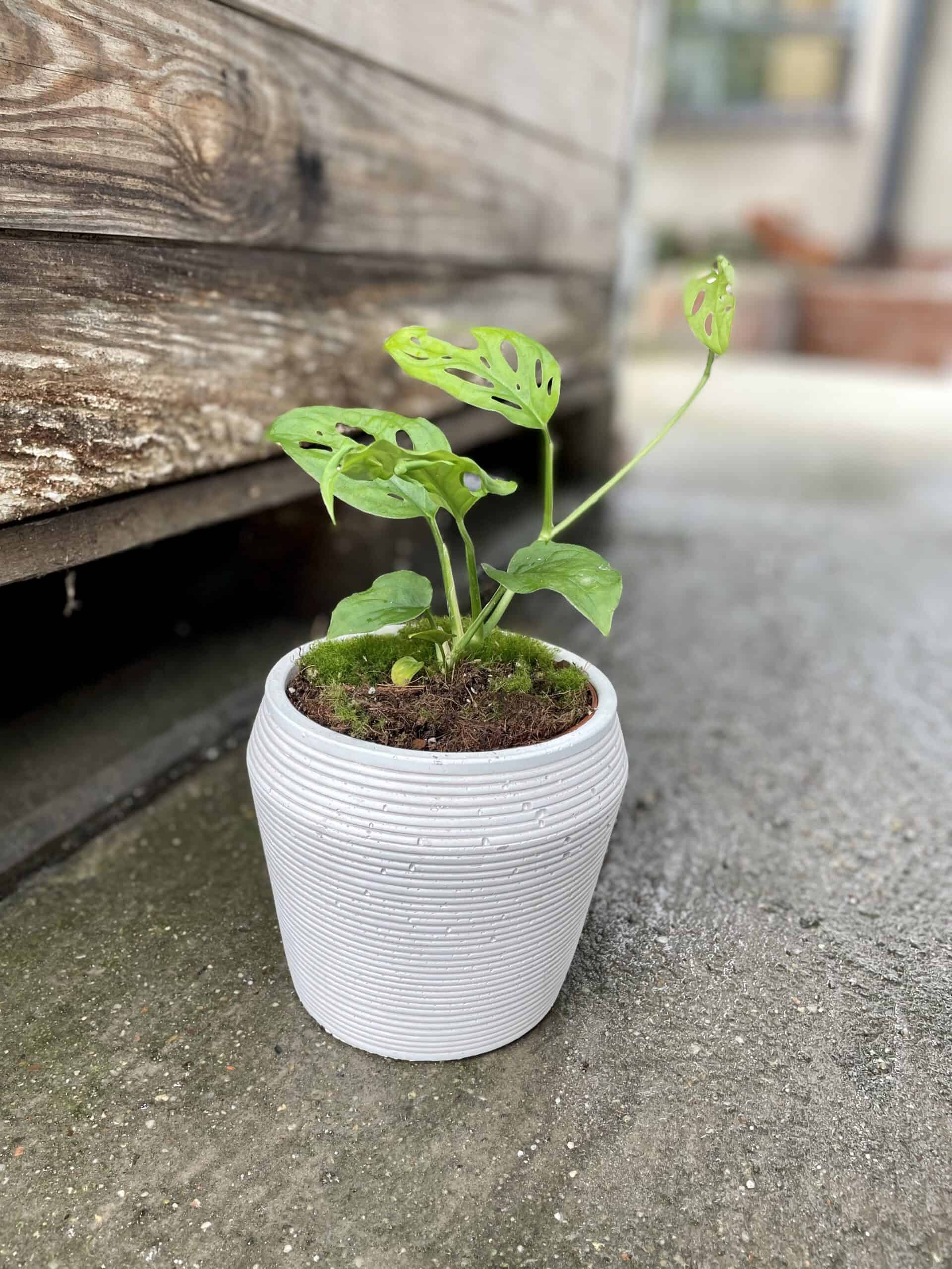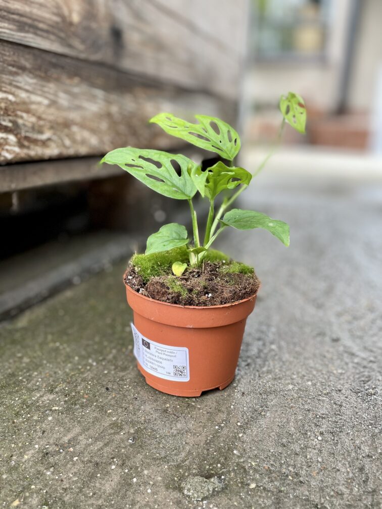 Widoczna na zdjęciu roślina: Monstera Esqueleto ma wysokość około 45 cm. Jej doniczka ma 12 cm średnicy oraz 11 cm wysokości.