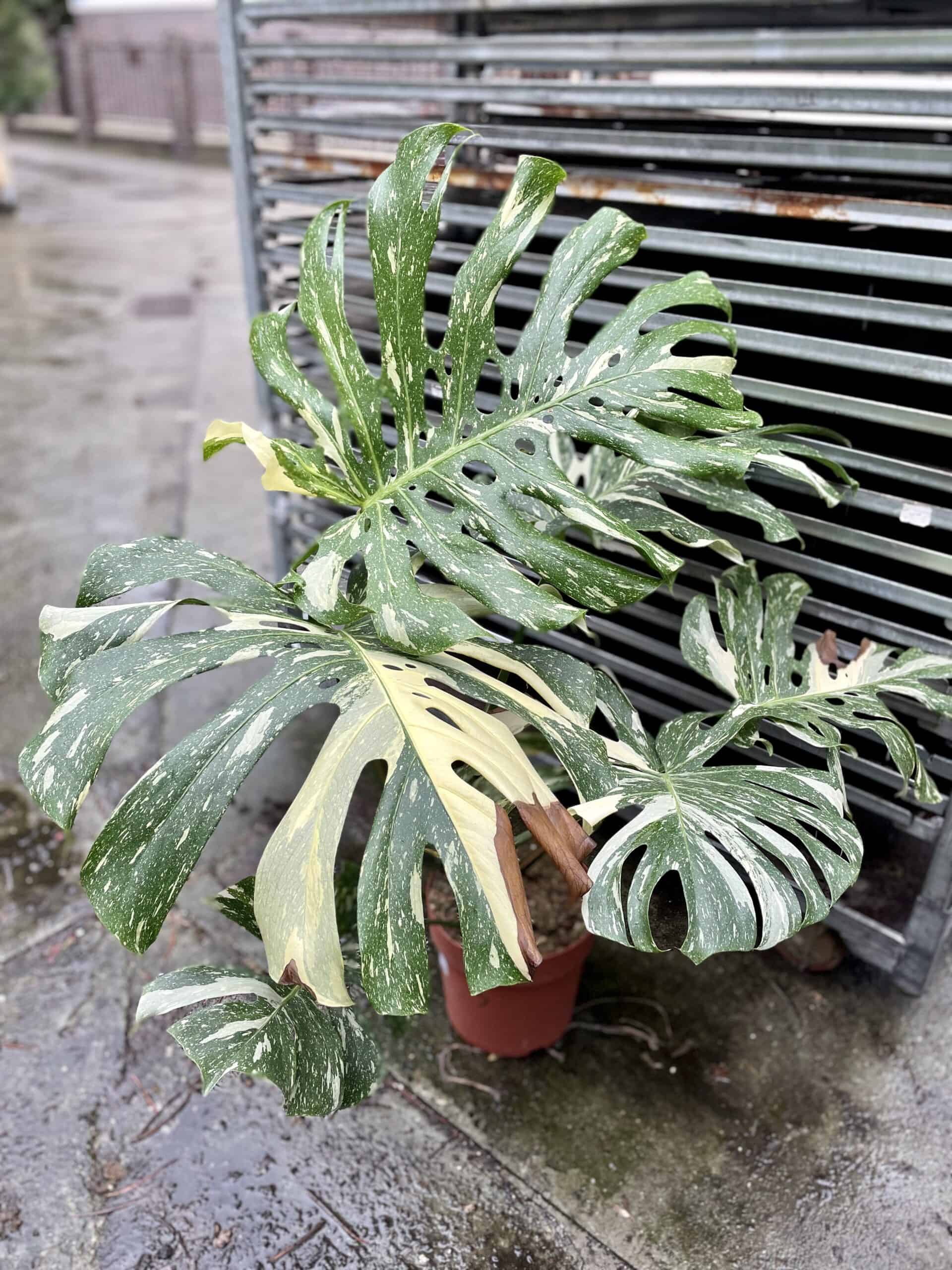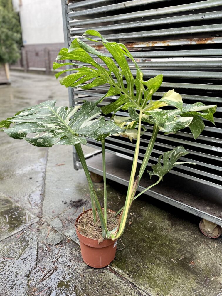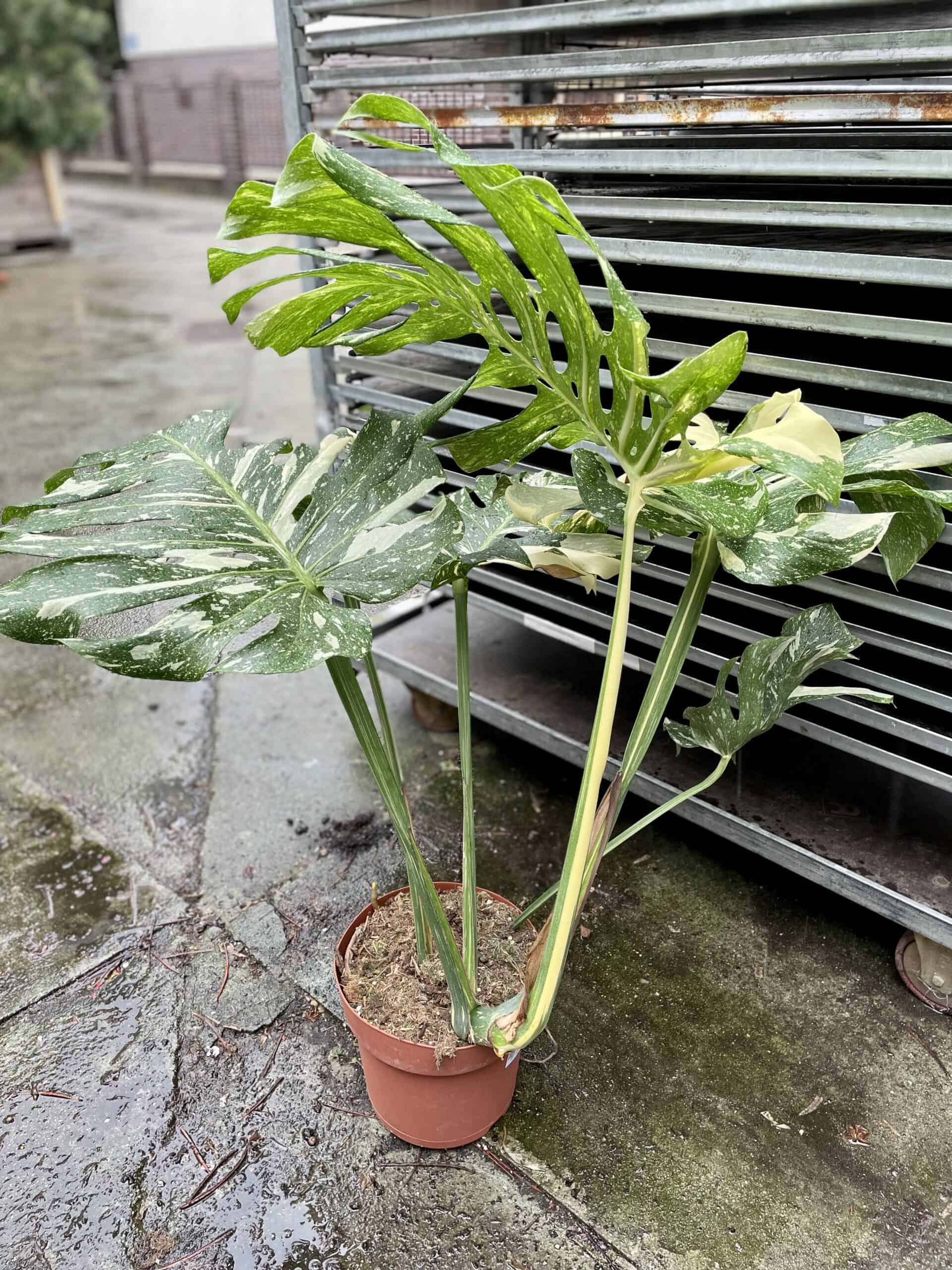 Widoczna na zdjęciu roślina: Monstera Thai Constellation ma wysokość około 100 cm. Jej doniczka ma 24 cm średnicy oraz 22 cm wysokości.