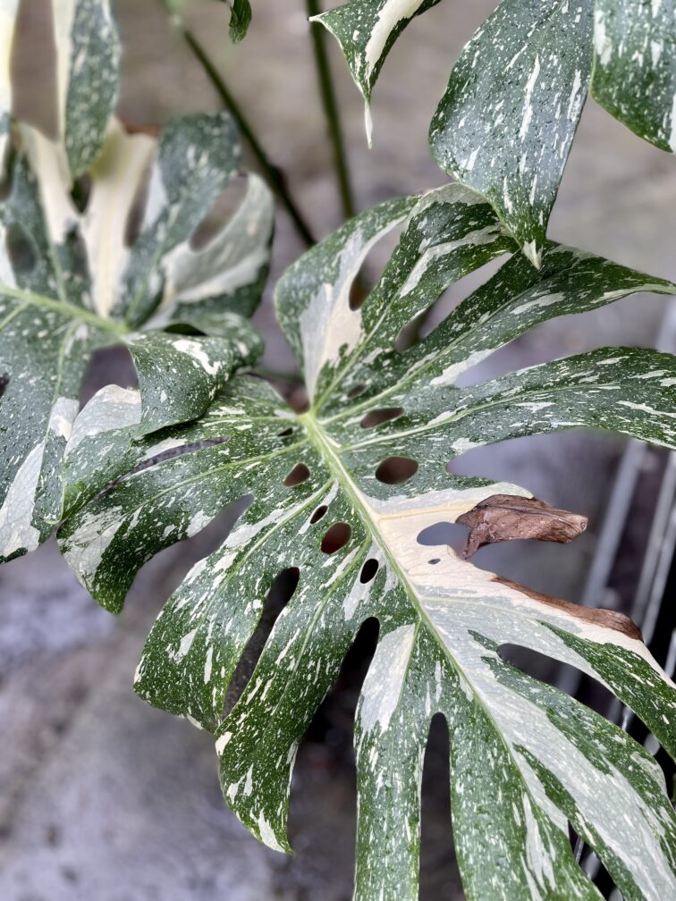 Na co trzeba uważać?: Roślinę, szczególnie w okresie letnim przeglądamy pod kątem obecności szkodników takich jak: przędziorki, wciornastki. Uważamy również na podlewanie, nie dopuszczamy do nadmiernego podlewania i zalegania wody w podłożu. W przeciwnym razie na liściach szybko pojawią się plamy. Jeśli na jasnych częściach Twojej monstery pojawiają się suche, brązowe plamy, może to oznaczać, że roślina dostaje niewystarczającą ilość światła.