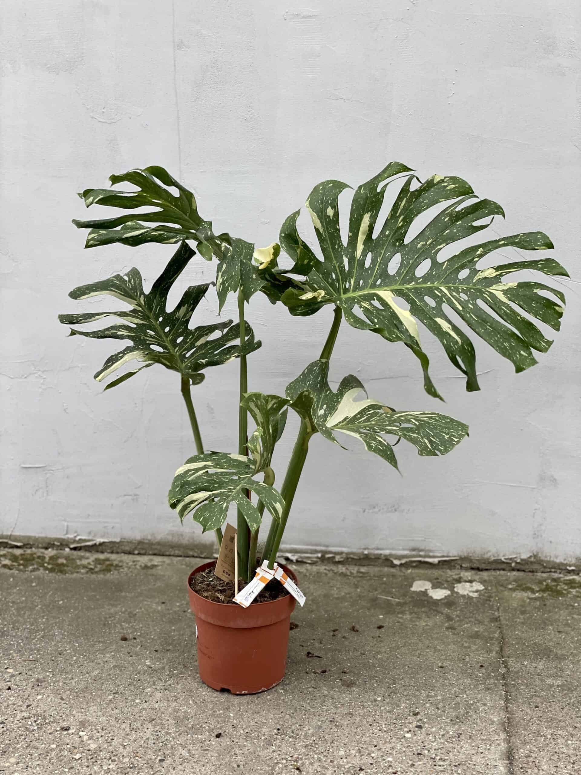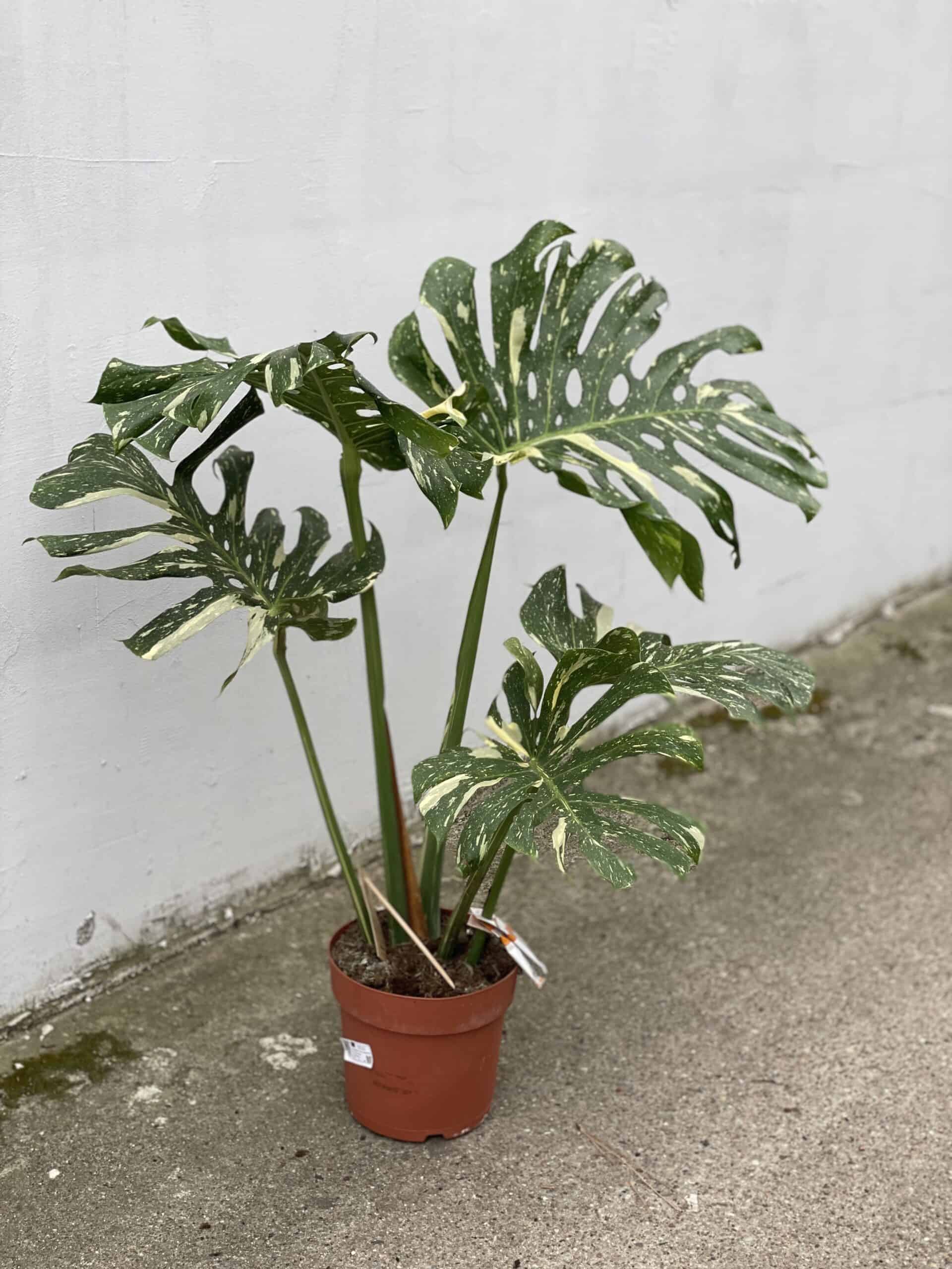 Widoczna na zdjęciu roślina: Monstera Thai Constellation ma wysokość około 105 cm. Jej doniczka ma 24 cm średnicy oraz 22 cm wysokości.