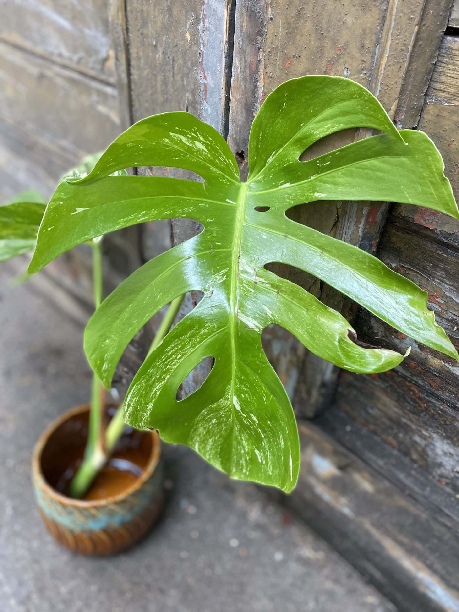 Widoczna na zdjęciu roślina: Monstera variegata - sadzonka cięta szczytowa ma wysokość około 1 cm. Jej doniczka ma 1 cm średnicy oraz 1 cm wysokości.