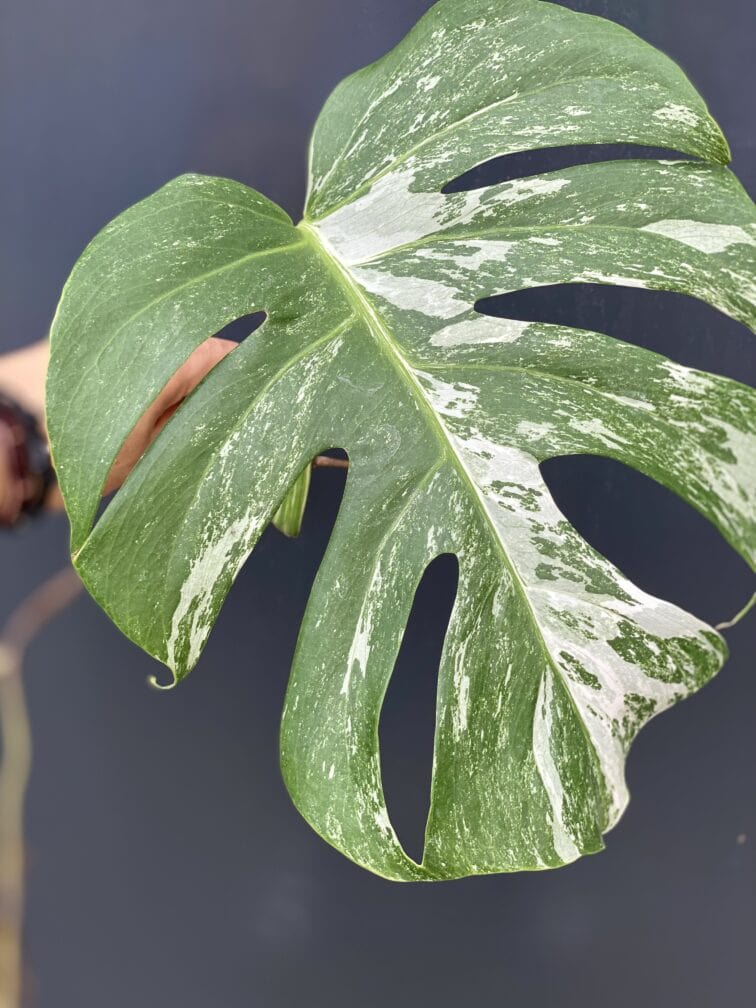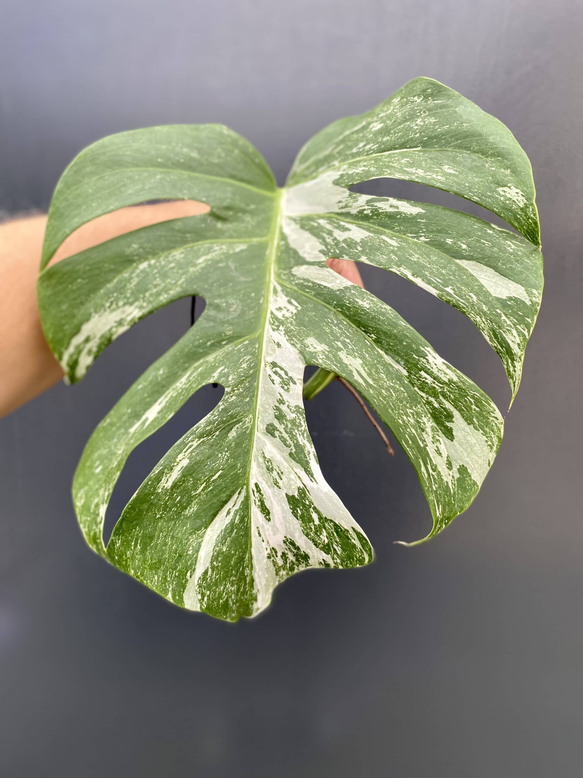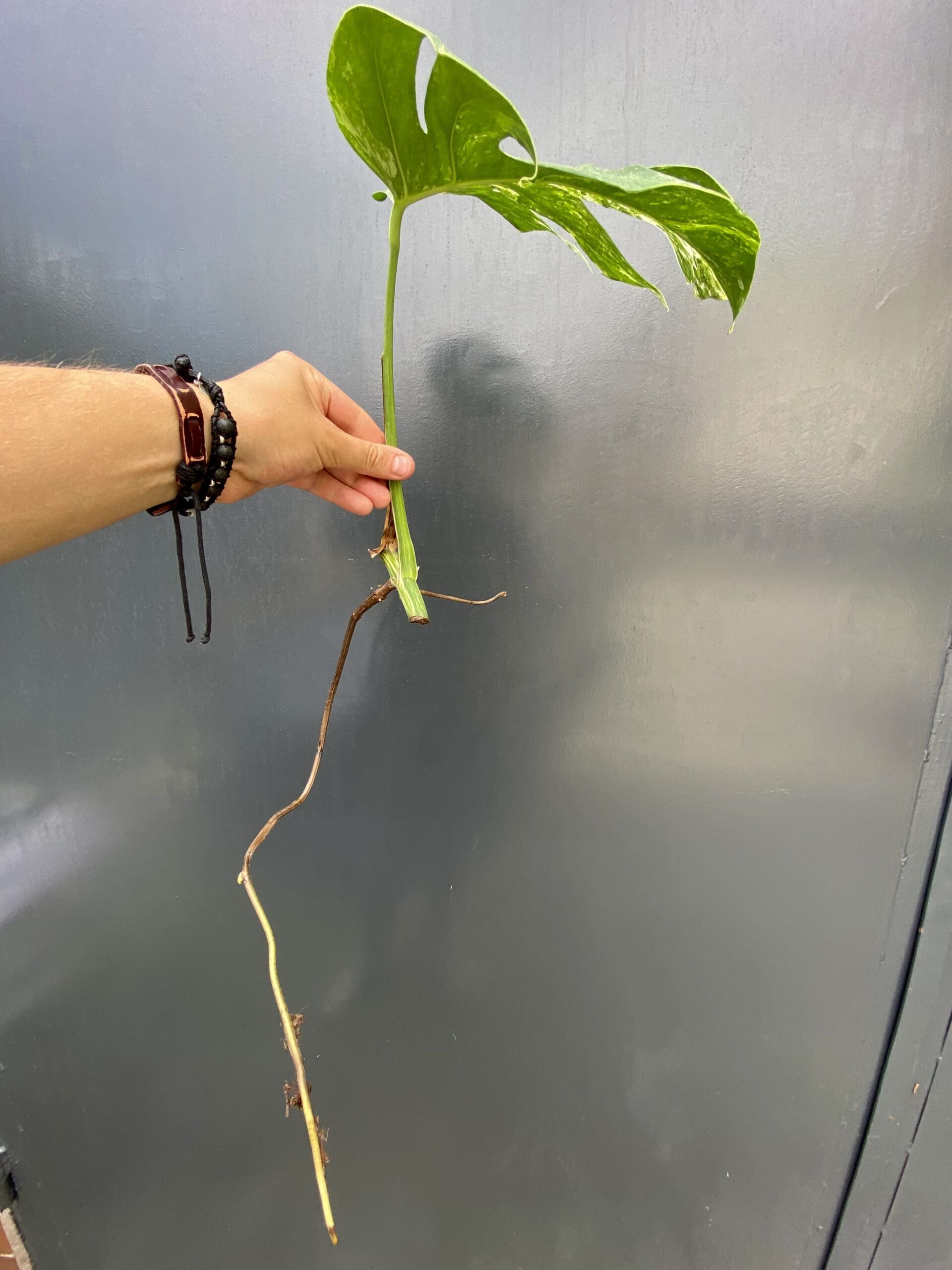 Widoczna na zdjęciu roślina: Monstera variegata - sadzonka pędowa ma wysokość około 20 cm. Jej doniczka ma 1 cm średnicy oraz 1 cm wysokości.