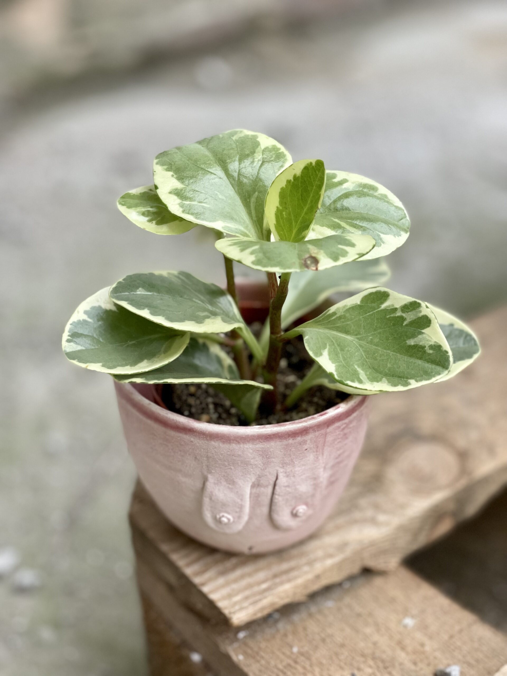 Na jednym ze zdjęć osłonka prezentowana jest w zestawie z rosliną: Peperomia obtusifolia variegataNIEDOSTĘPNY