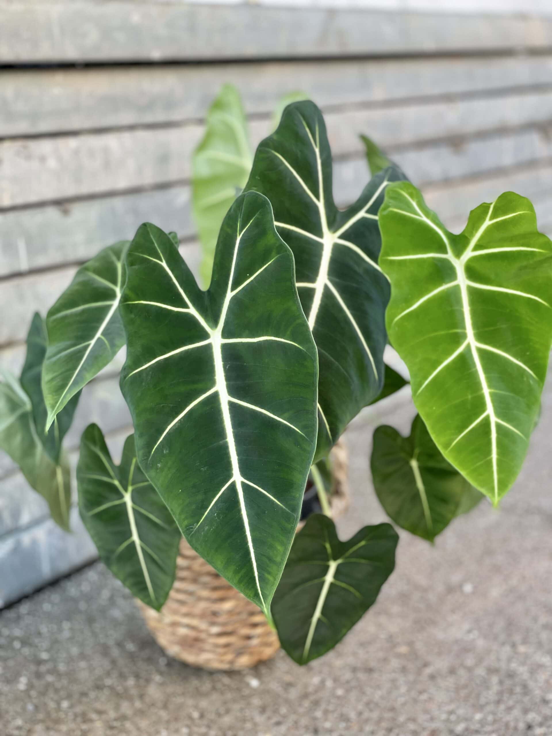 Na jednym ze zdjęć osłonka prezentowana jest w zestawie z rosliną: Alocasia micholitziana “Frydek” (Maxkowskii)NIEDOSTĘPNY