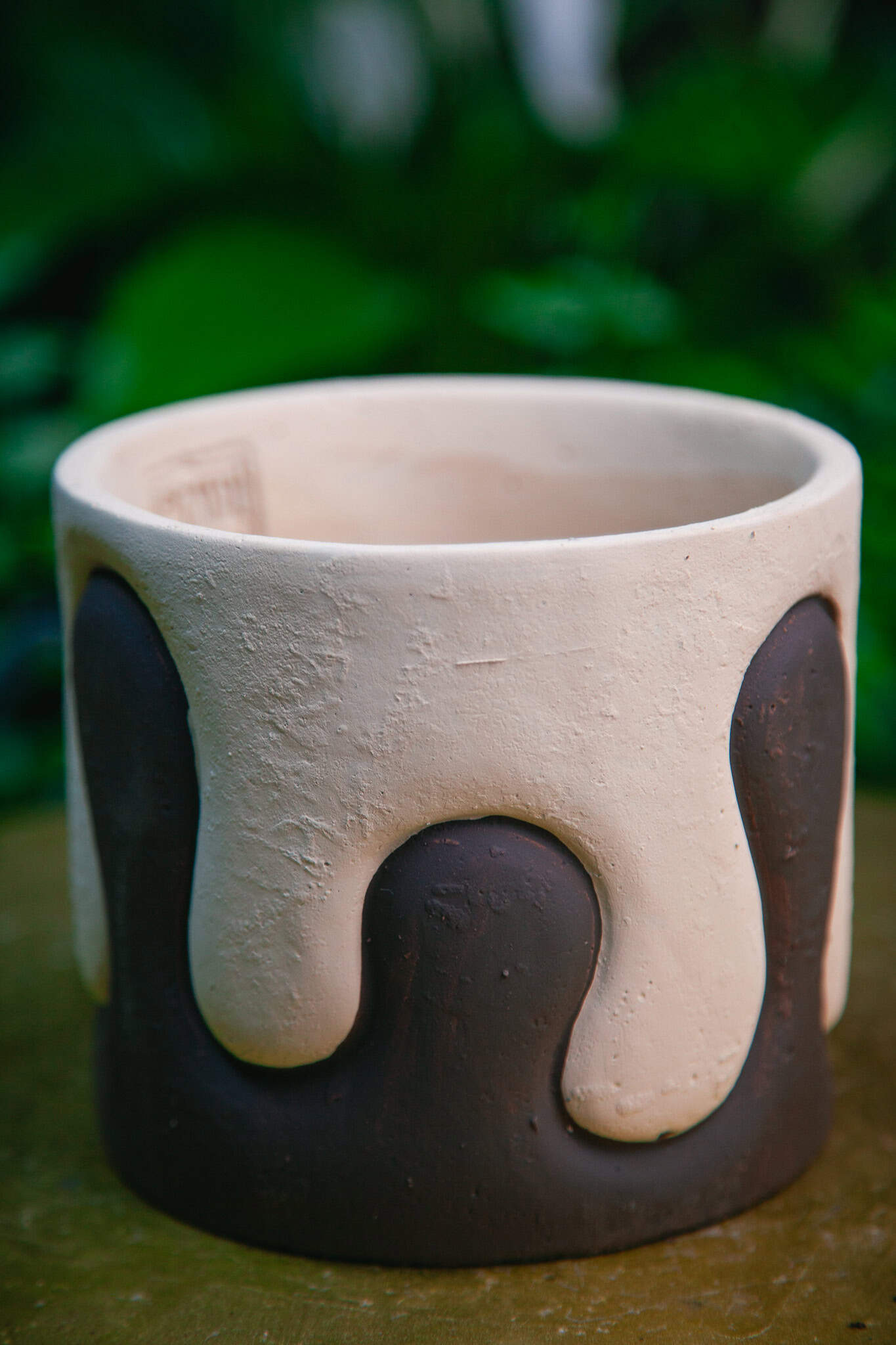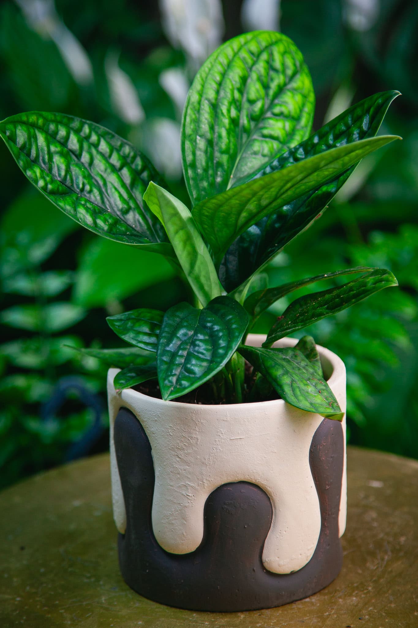 Na jednym ze zdjęć osłonka prezentowana jest w zestawie z rosliną: Monstera karstenianum (Monstera Peru)NIEDOSTĘPNY