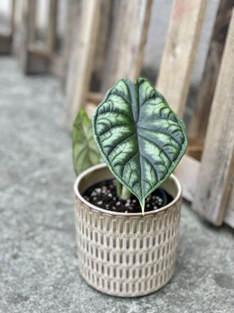 Na jednym ze zdjęć osłonka prezentowana jest w zestawie z rosliną: Alocasia baginda Dragon ScaleNIEDOSTĘPNY