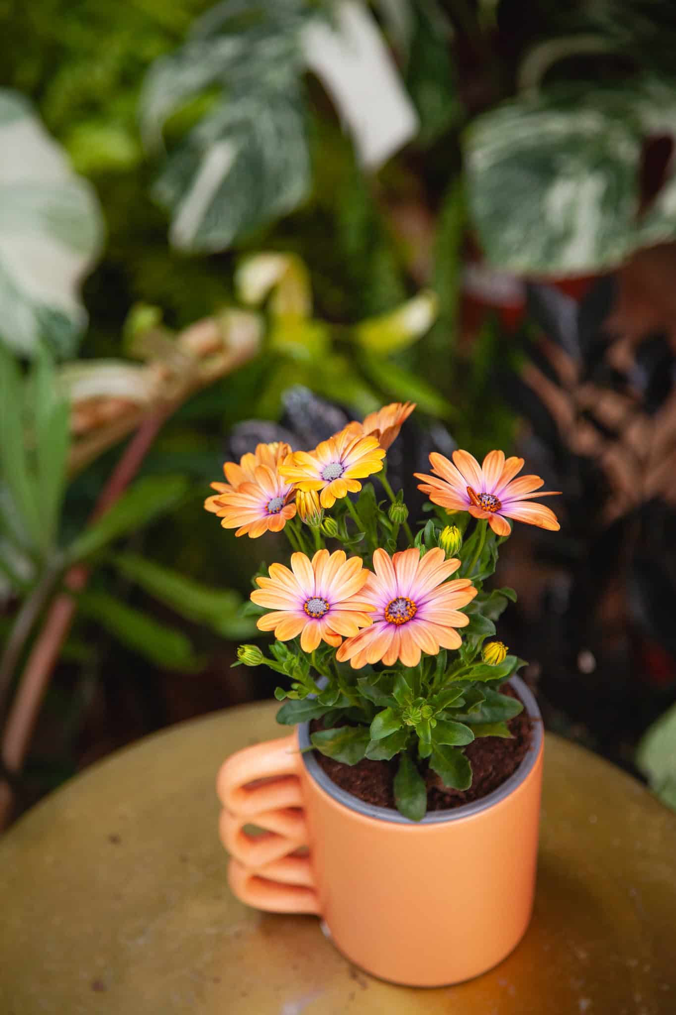 Widoczna na zdjęciu roślina: Osteospermum Orange (Stokrotka afrykańska) ma wysokość około 22 cm. Jej doniczka ma 10 cm średnicy oraz 10 cm wysokości.