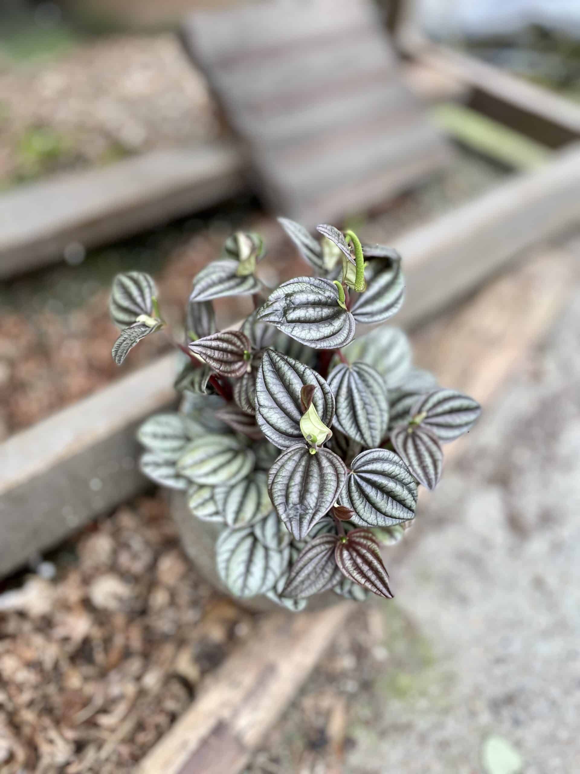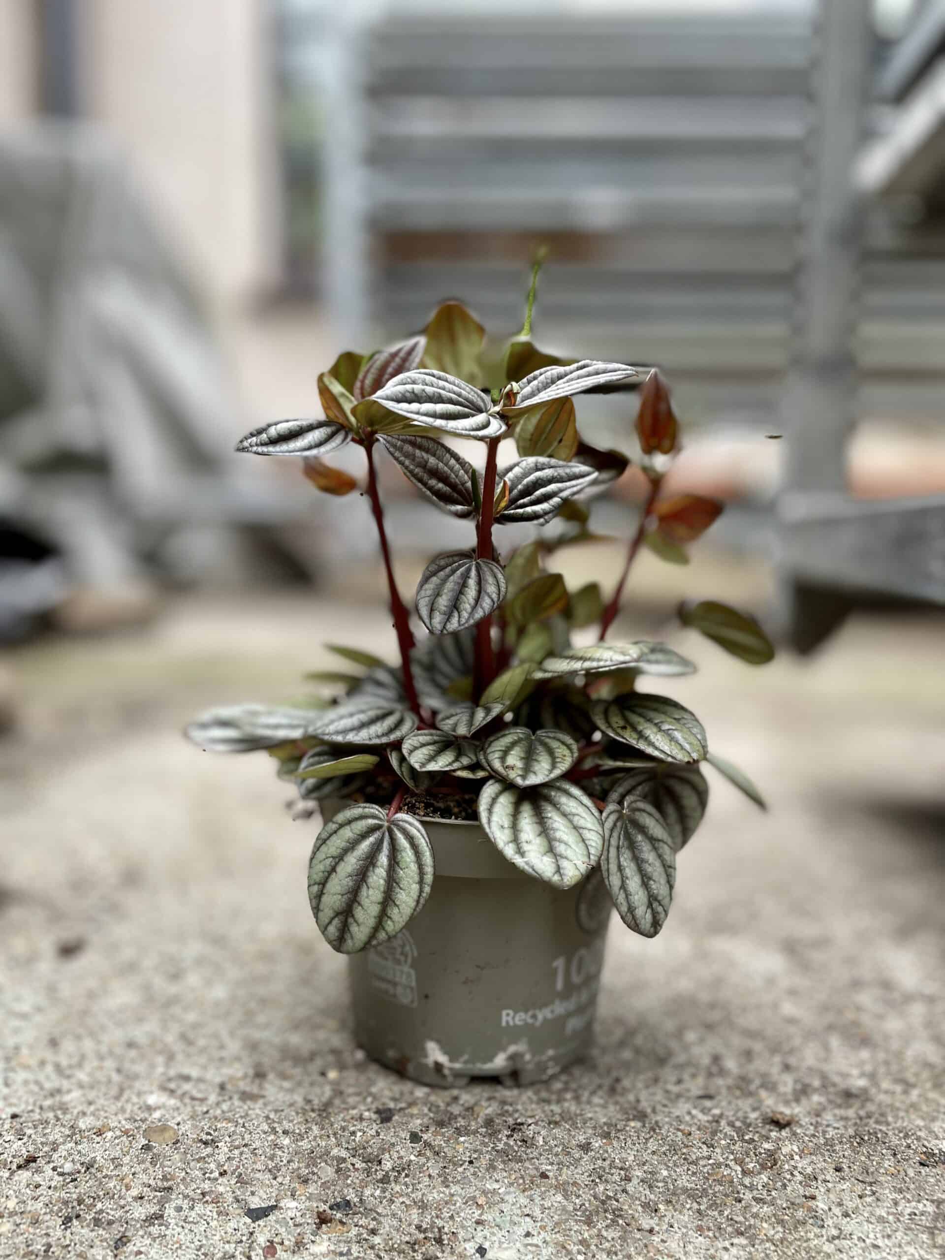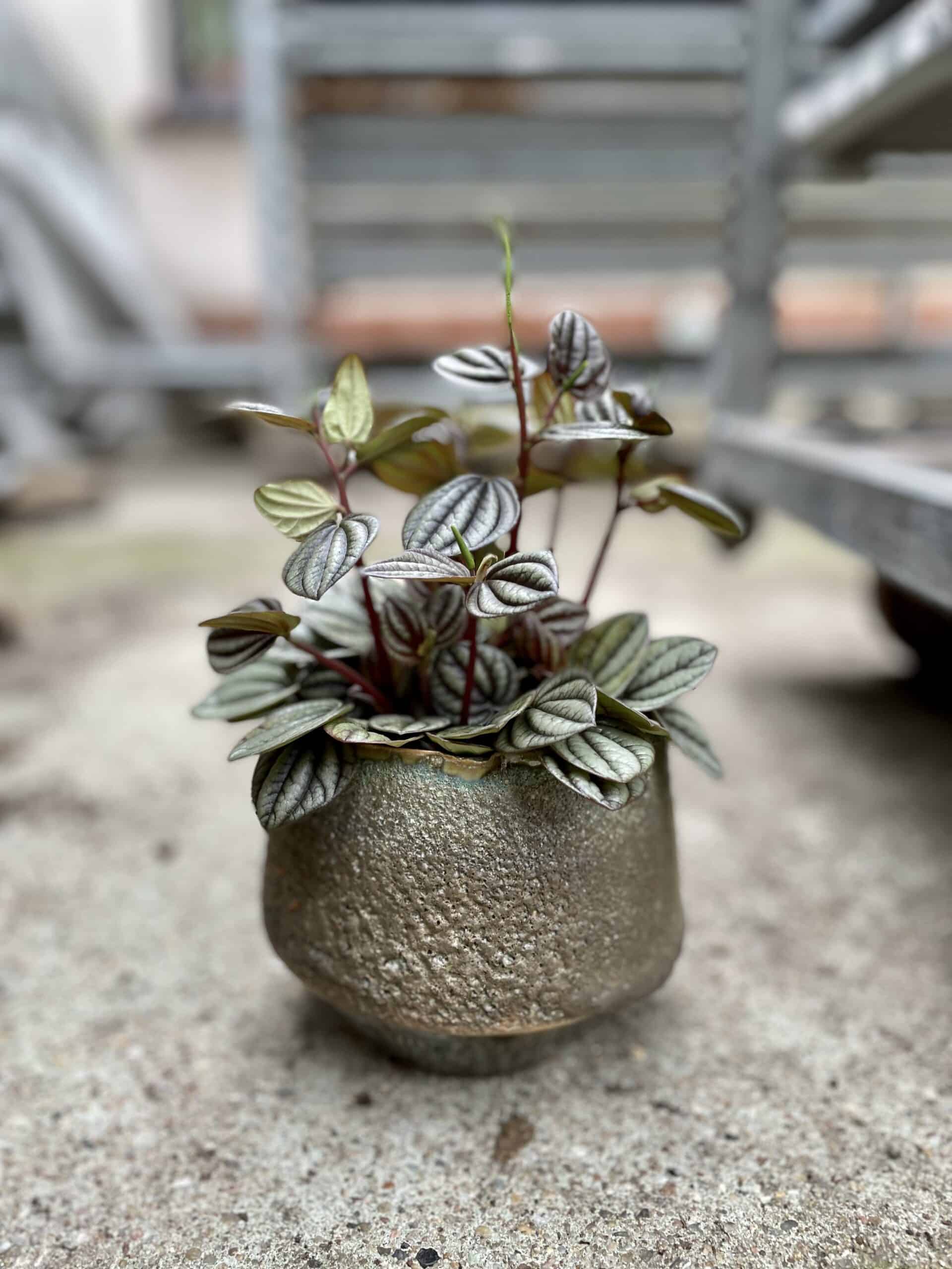 Peperomia, alias pieprzówka, o liściach z metalicznym połyskiem i wyraźnym, ozdobnym unerwieniem.
