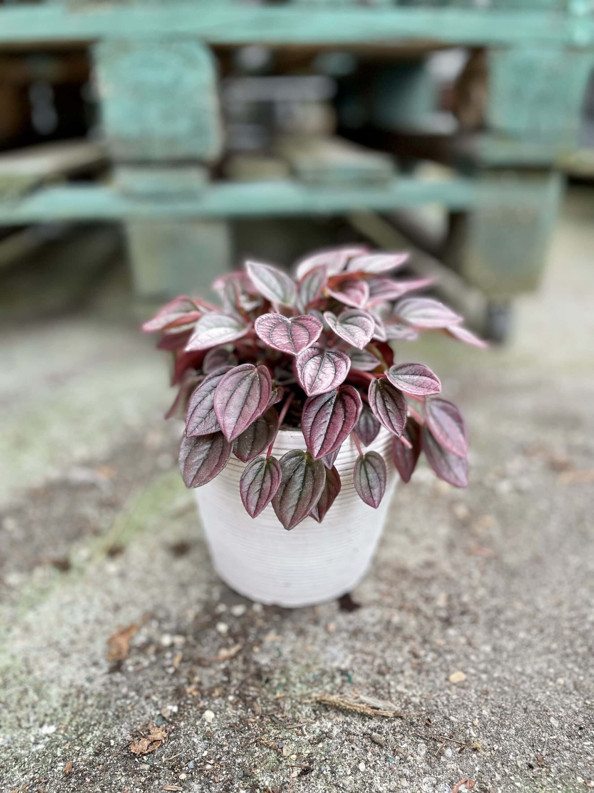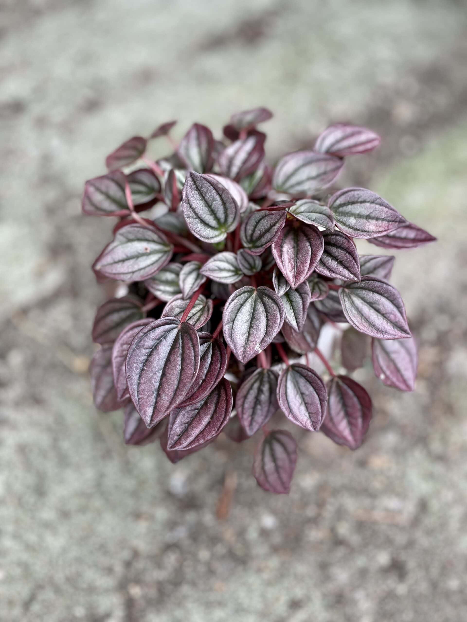 Olśniewająca Peperomia, której liście ozdabia subtelna, bordowa tonacja. Niektóre są intensywnie “buraczkowe”, inne mają więcej srebrzystości; wszystkie metalicznie błyszczą. Wygląda to trochę tak, jakby ktoś próbował purpurową roślinę przemalować na szaro. Obie warstwy kolorystyczne są obecne na liściach i przenikając się, tworzą niezwykle malowniczy efekt.