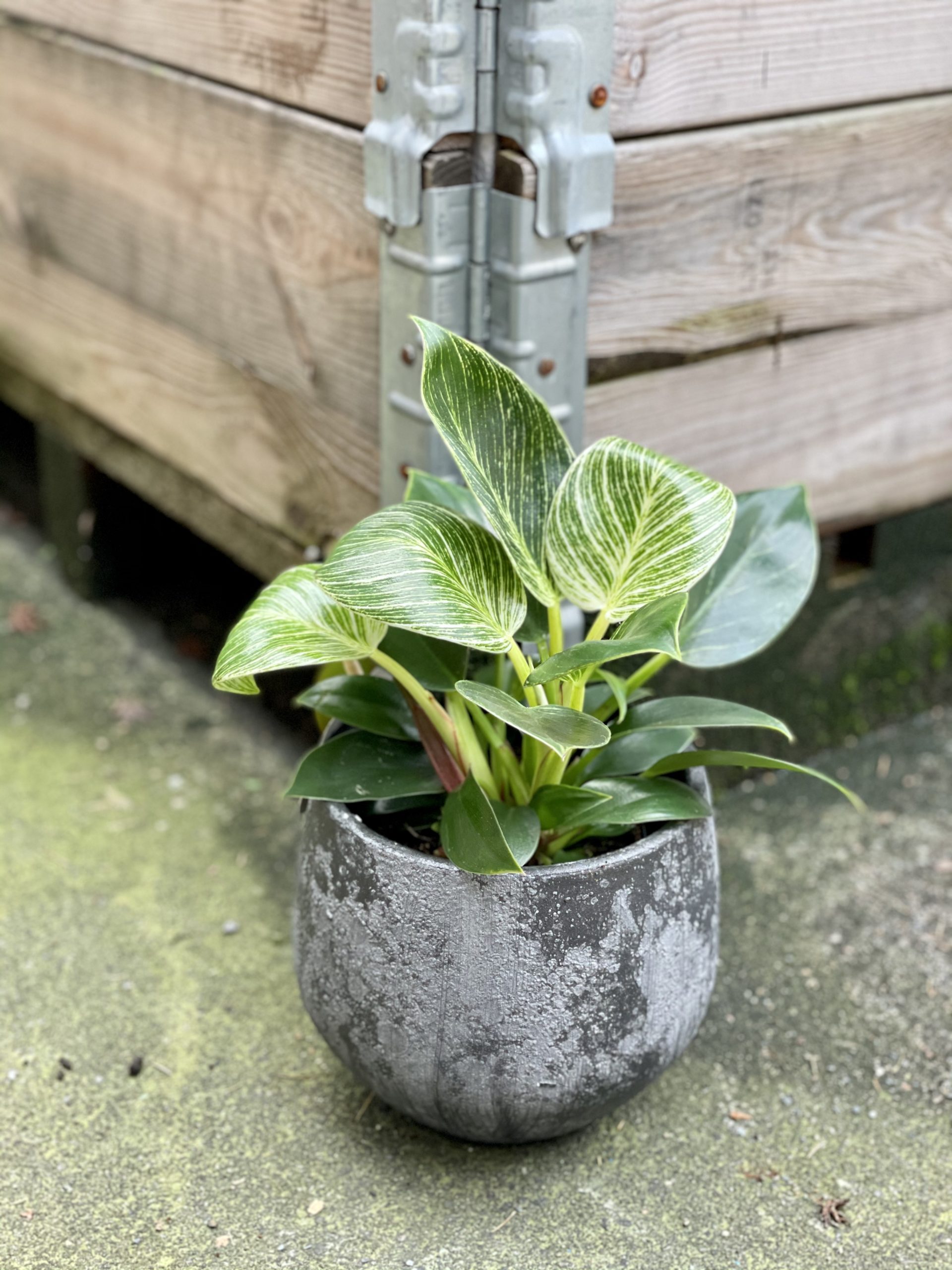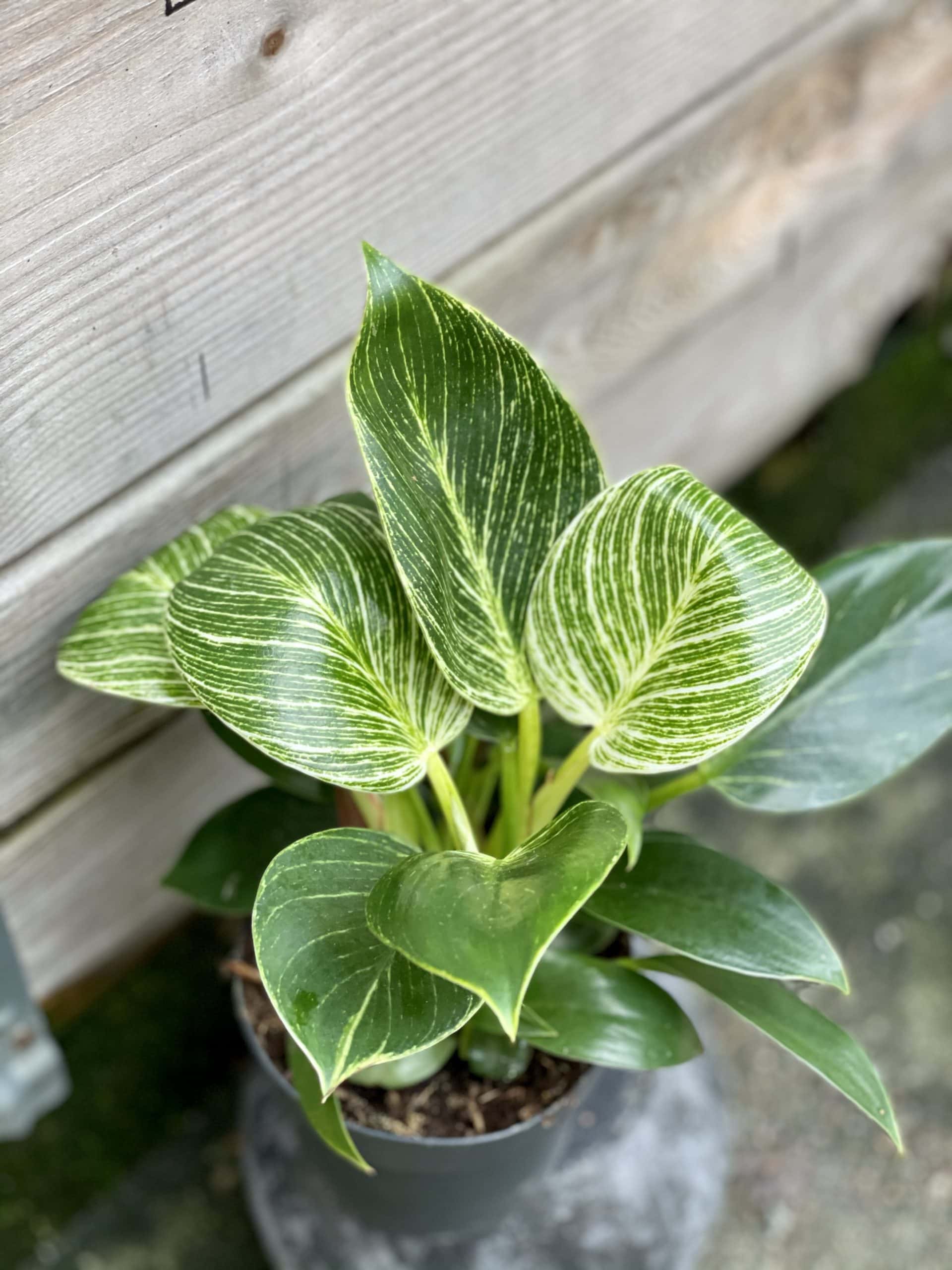 Widoczna na zdjęciu roślina: Philodendron Birkin ma wysokość około 25 cm. Jej doniczka ma 11 cm średnicy oraz 9 cm wysokości.