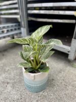 Widoczna na zdjęciu roślina: Philodendron Birkin ma wysokość około 30 cm. Jej doniczka ma 14 cm średnicy oraz 11 cm wysokości.