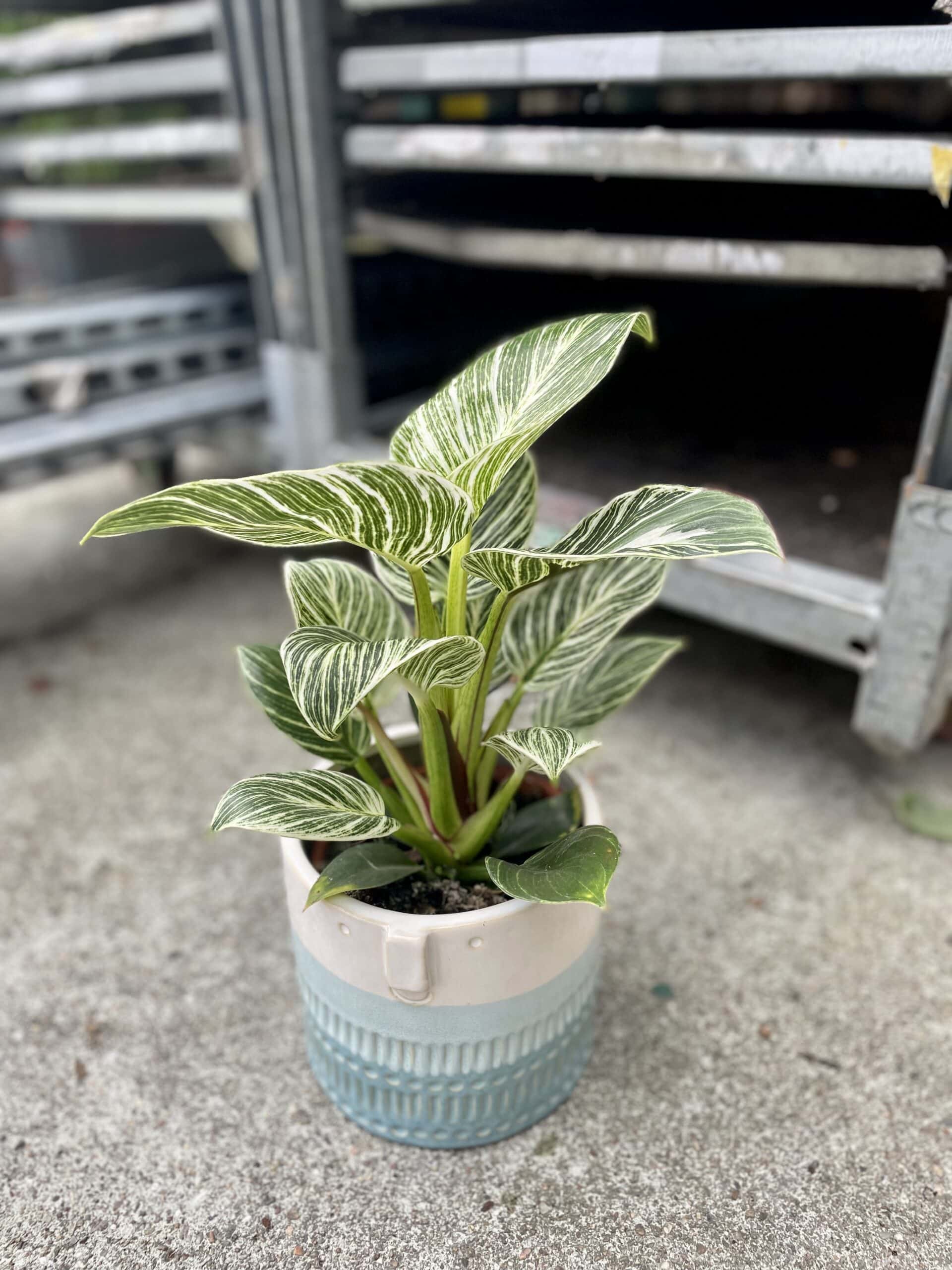 Przykuwająca wzrok odmiana filodendrona o zwartym pokroju i przepięknie wybarwionych liściach. Dolne liście maja głęboki ciemnozielony kolor, a górne biało-zielony z wyraźnie zarysowanym paskowaniem