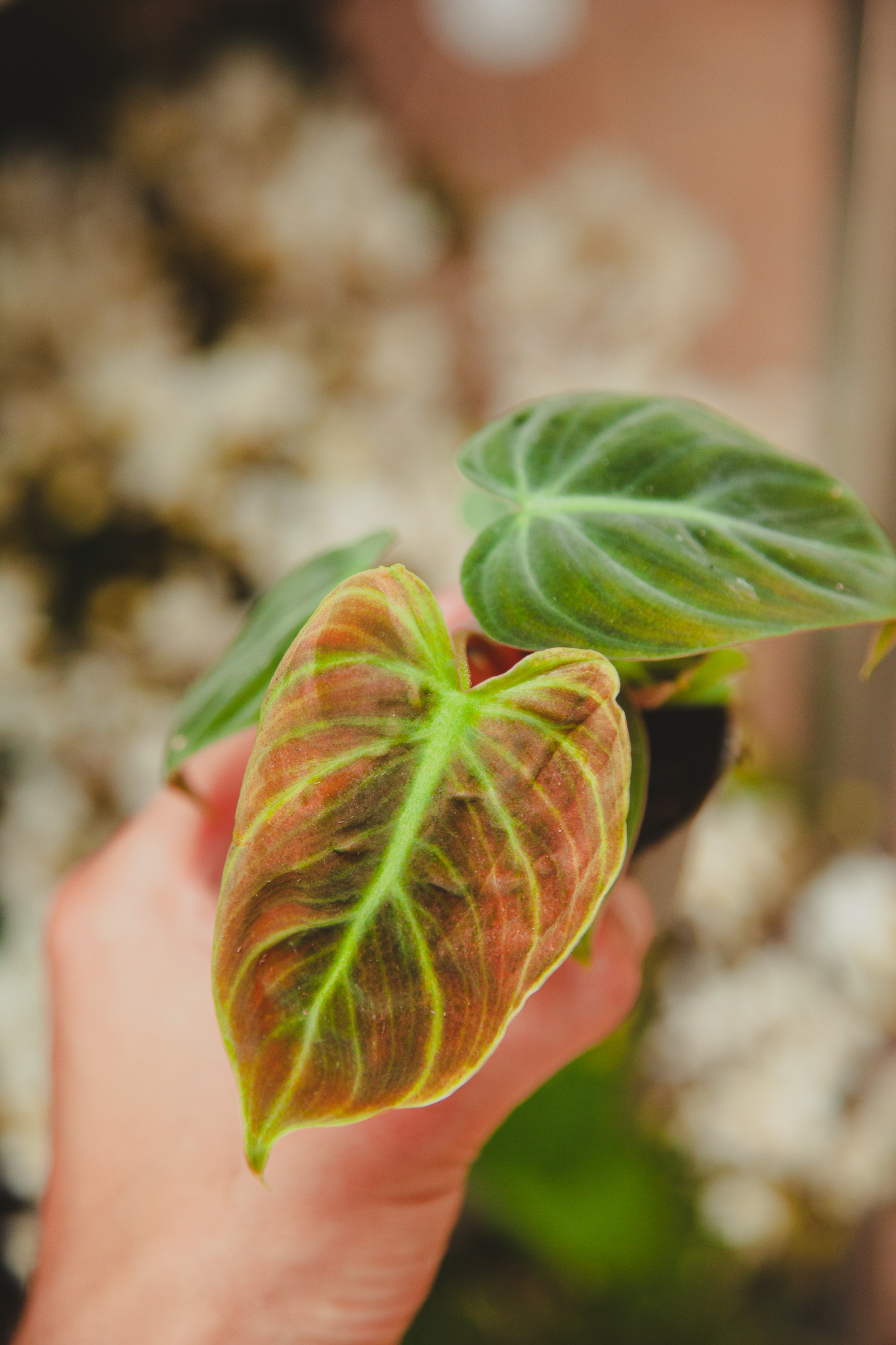 Widoczna na zdjęciu roślina: Philodendron rubrijuvenile El Choco Red ma wysokość około 10 cm. Jej doniczka ma 6 cm średnicy oraz 5 cm wysokości.