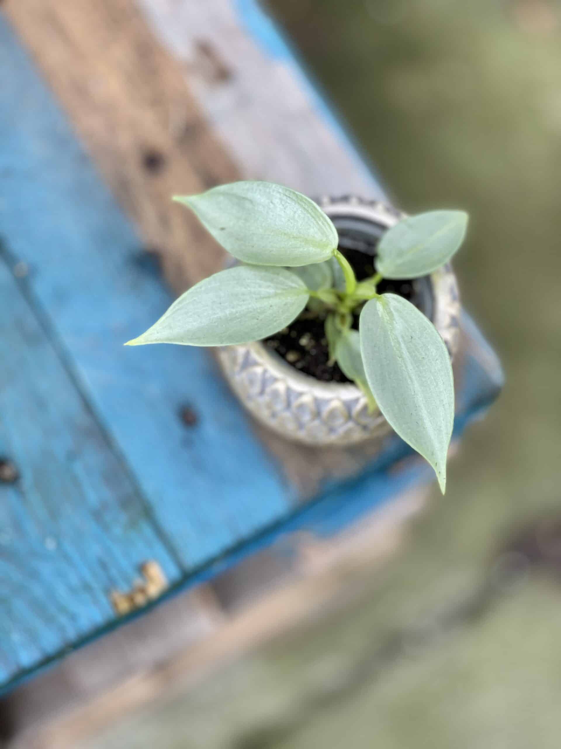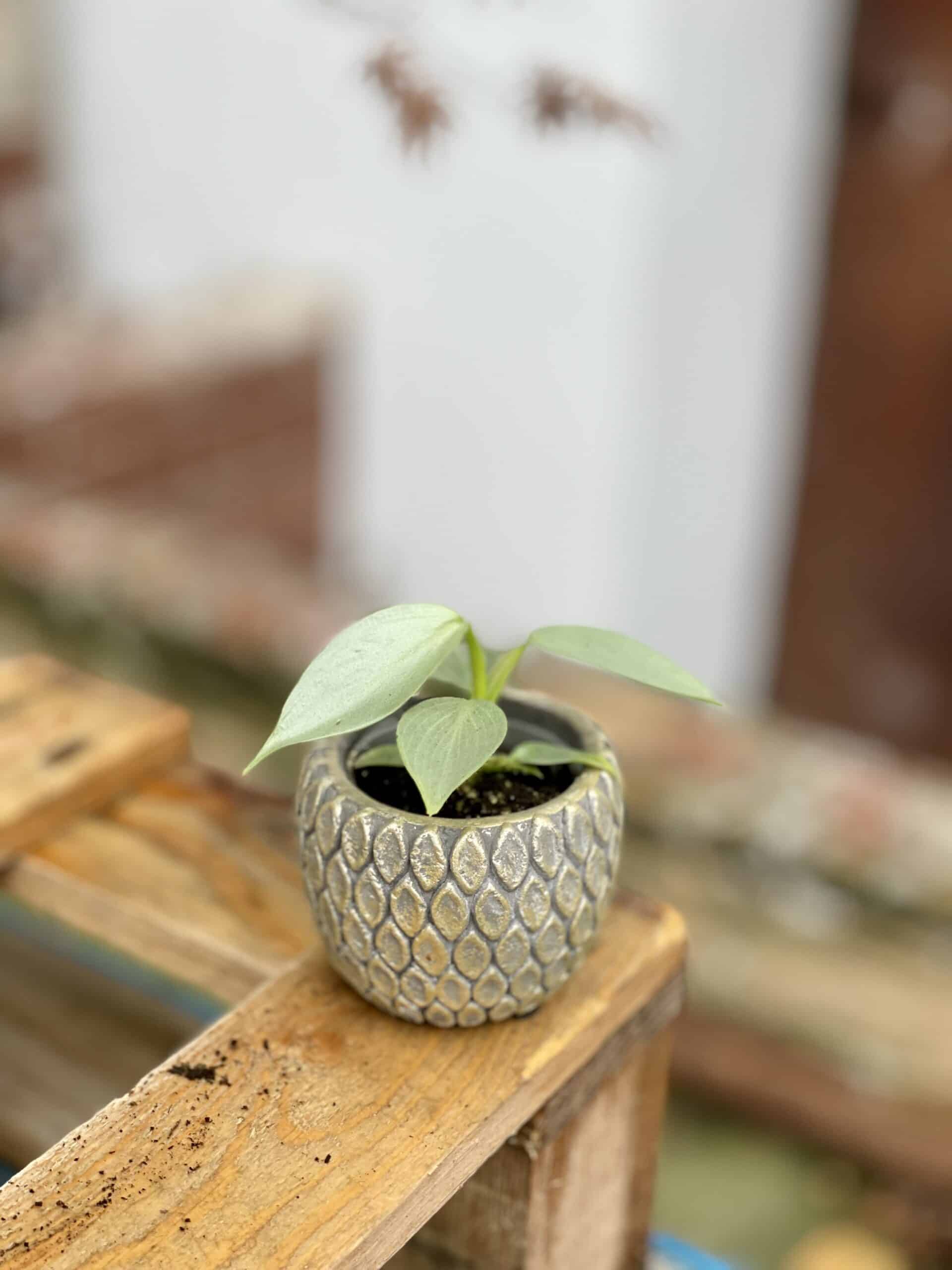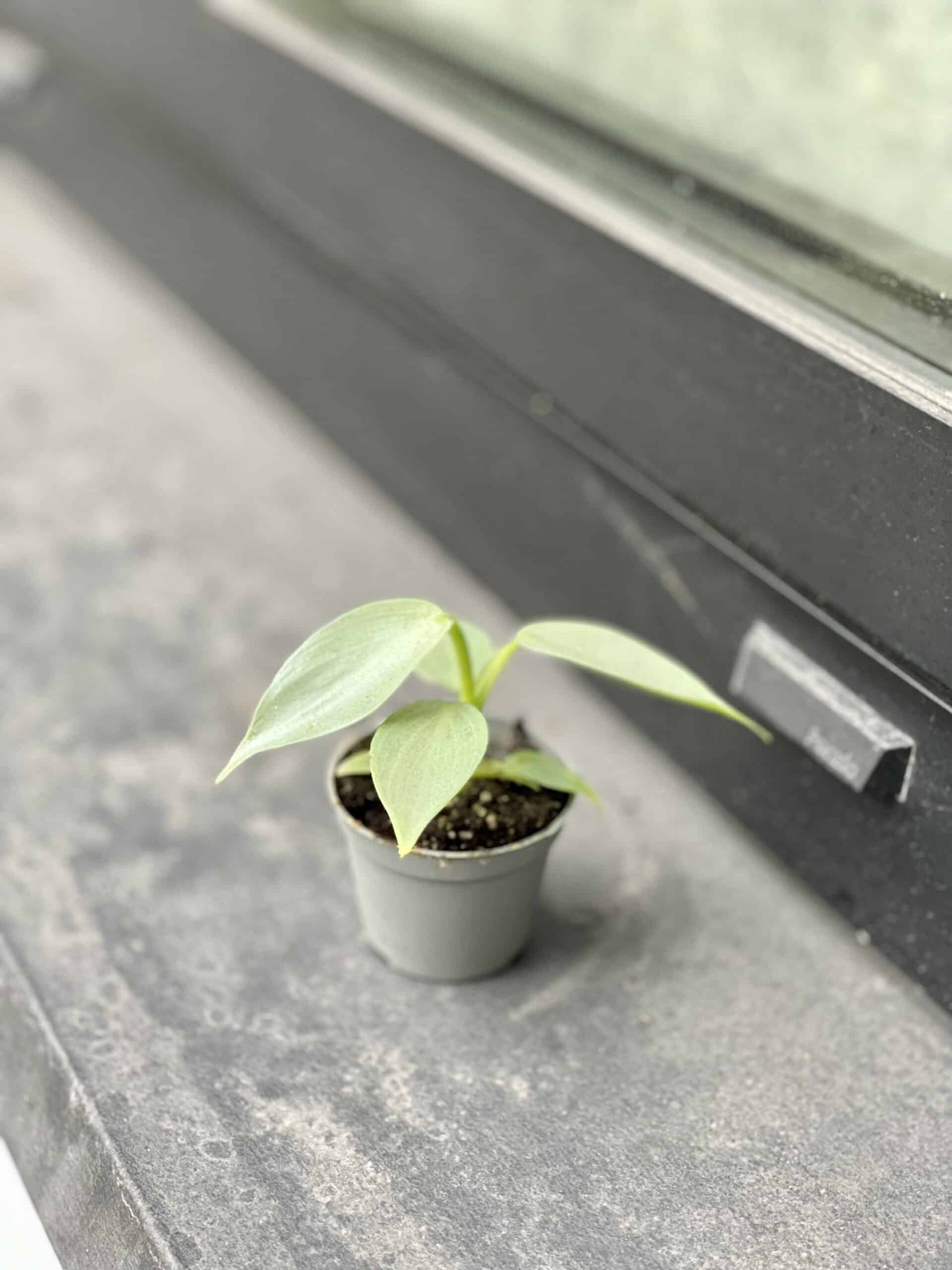 Widoczna na zdjęciu roślina: Philodendron Hastatum ma wysokość około 13 cm. Jej doniczka ma 6 cm średnicy oraz 5 cm wysokości.