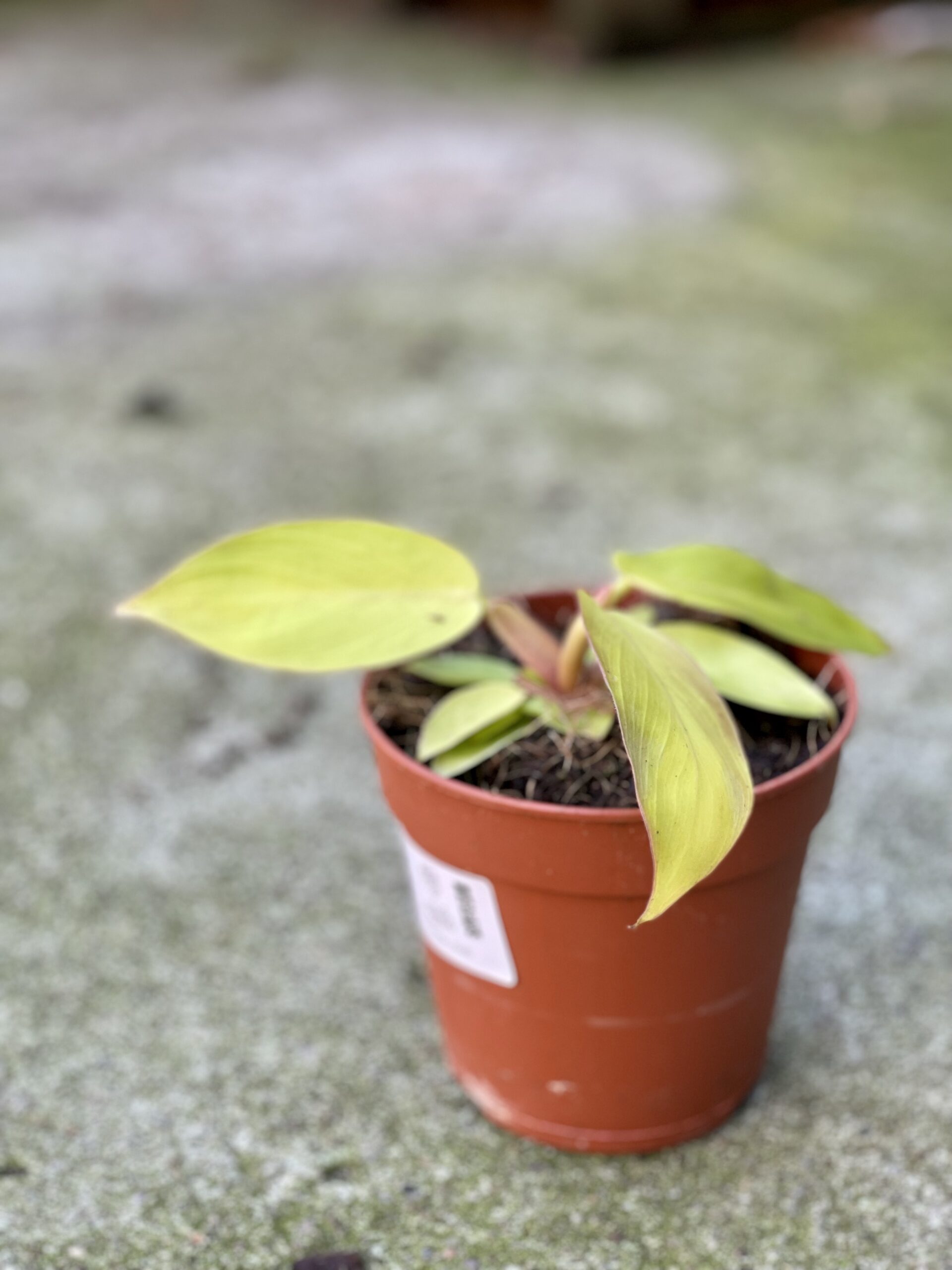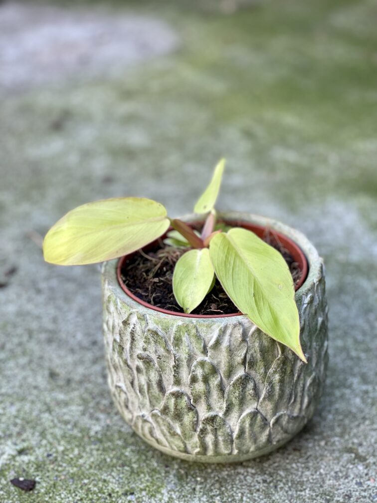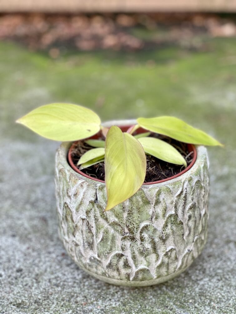 Widoczna na zdjęciu roślina: Philodendron Prince of Orange ma wysokość około 30 cm. Jej doniczka ma 12 cm średnicy oraz 10 cm wysokości.