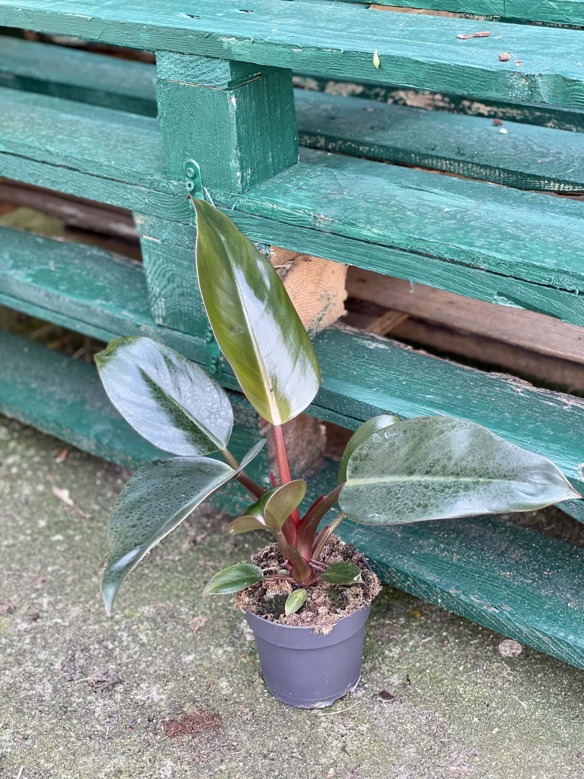 Widoczna na zdjęciu roślina: Philodendron Rojo Congo ma wysokość około 30 cm. Jej doniczka ma 10 cm średnicy oraz 9 cm wysokości.