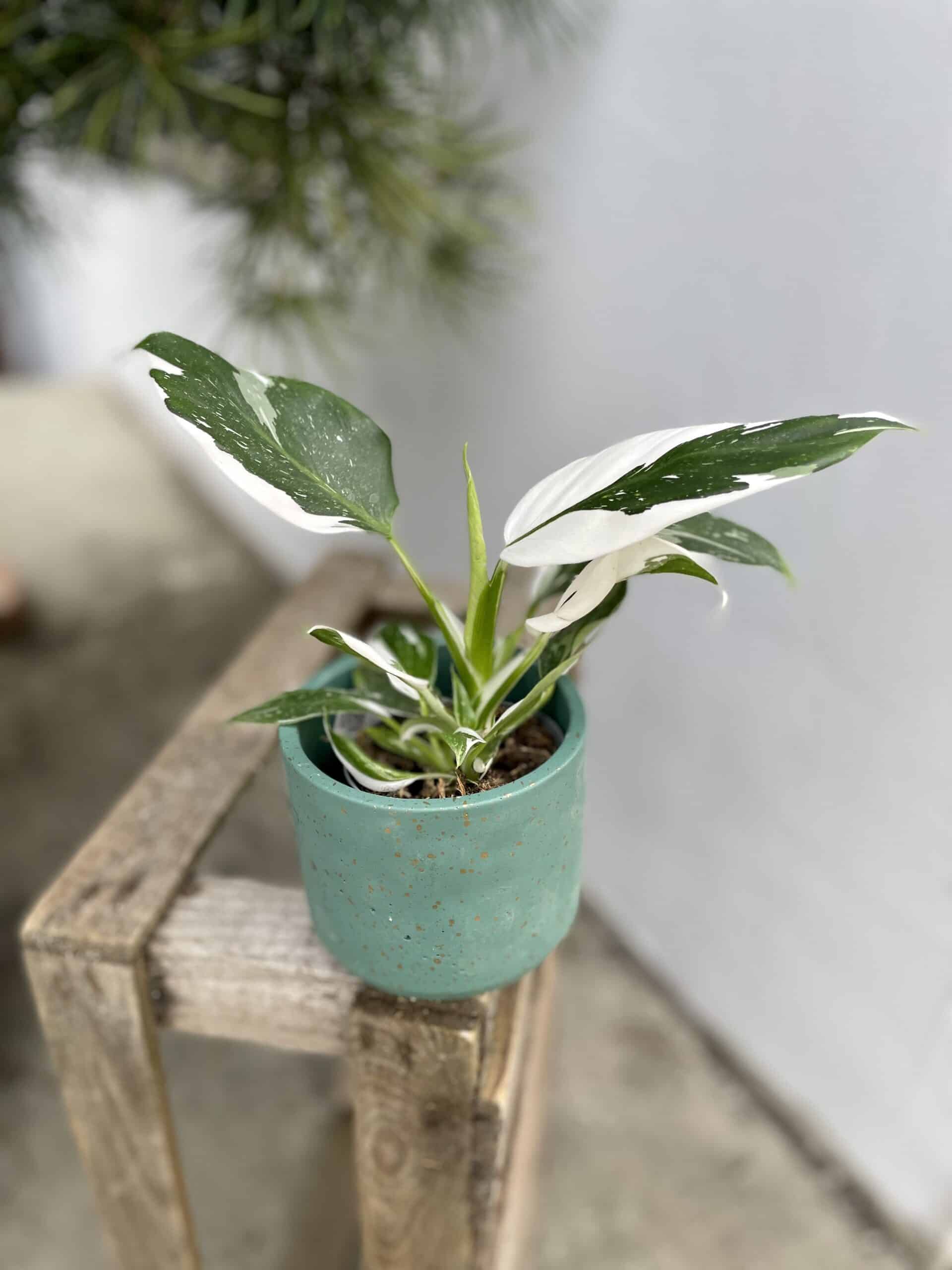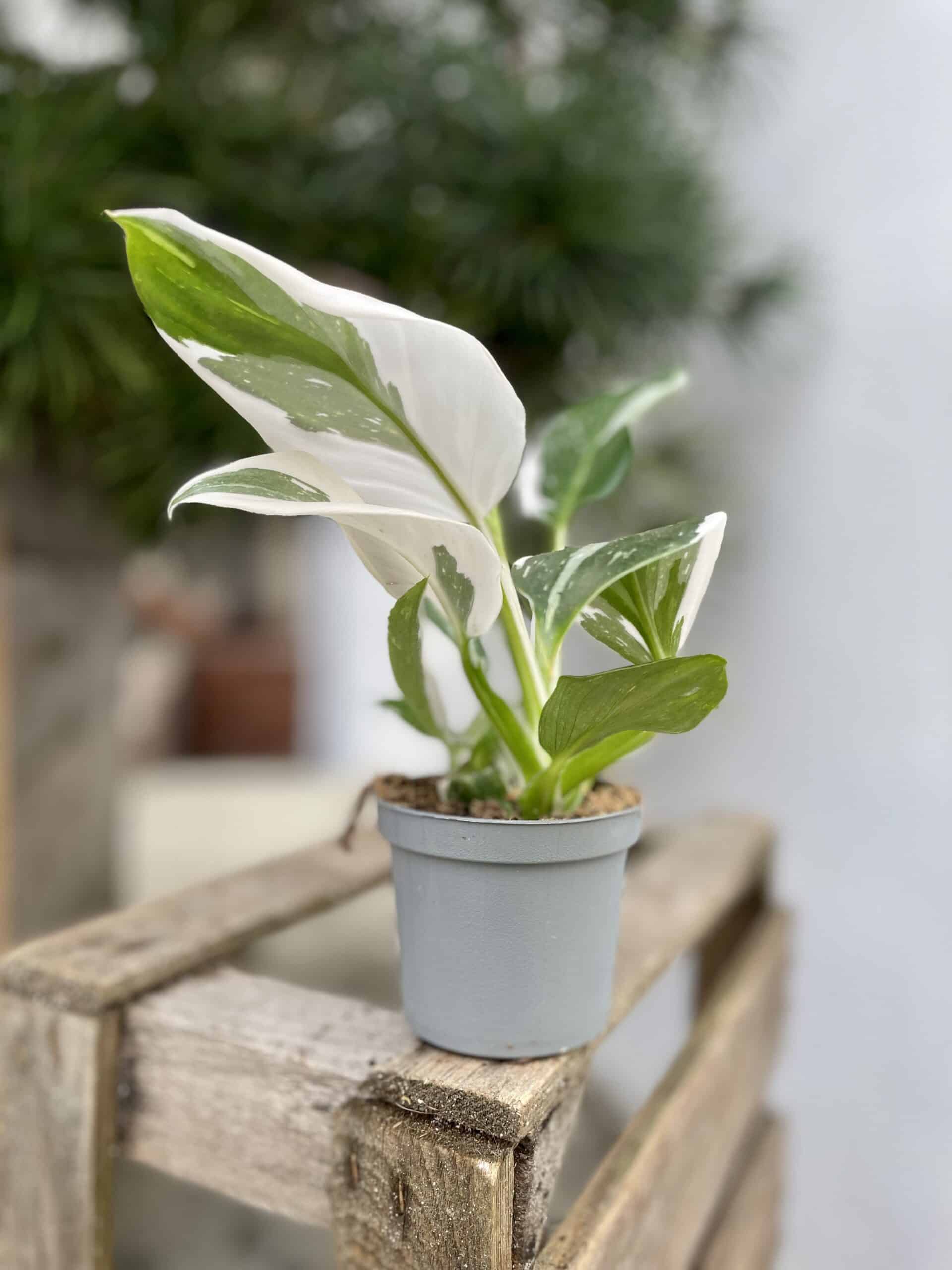 Widoczna na zdjęciu roślina: Philodendron White Wizard ma wysokość około 25 cm. Jej doniczka ma 9 cm średnicy oraz 7 cm wysokości.