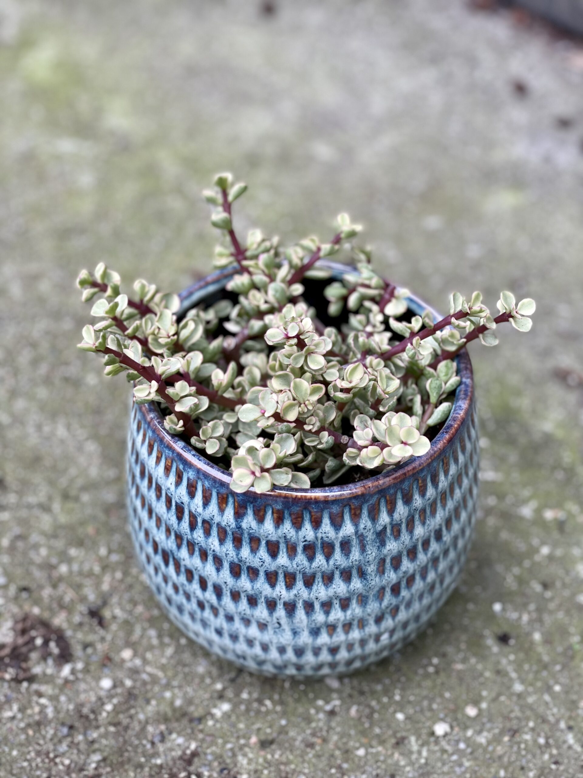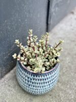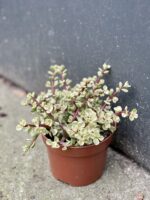 Portulacaria Afra variegata to piękny sukulent, u którego zielono-kremowe mięsiste liście osadzone są na czerwono-brązowych łodygach. Docelowo portulacaria wyrośnie na urokliwą roślinę o krzewiastym pokroju.