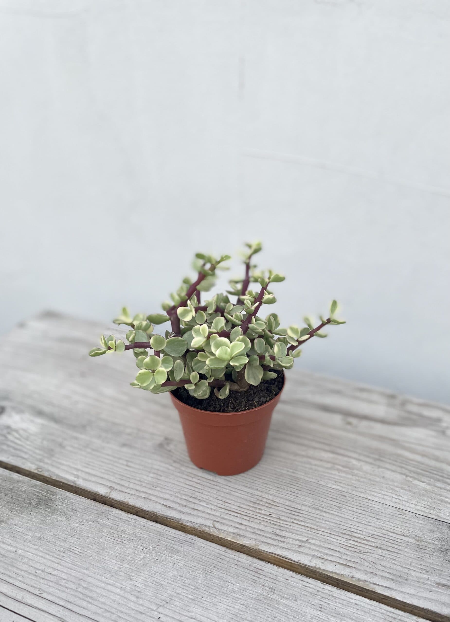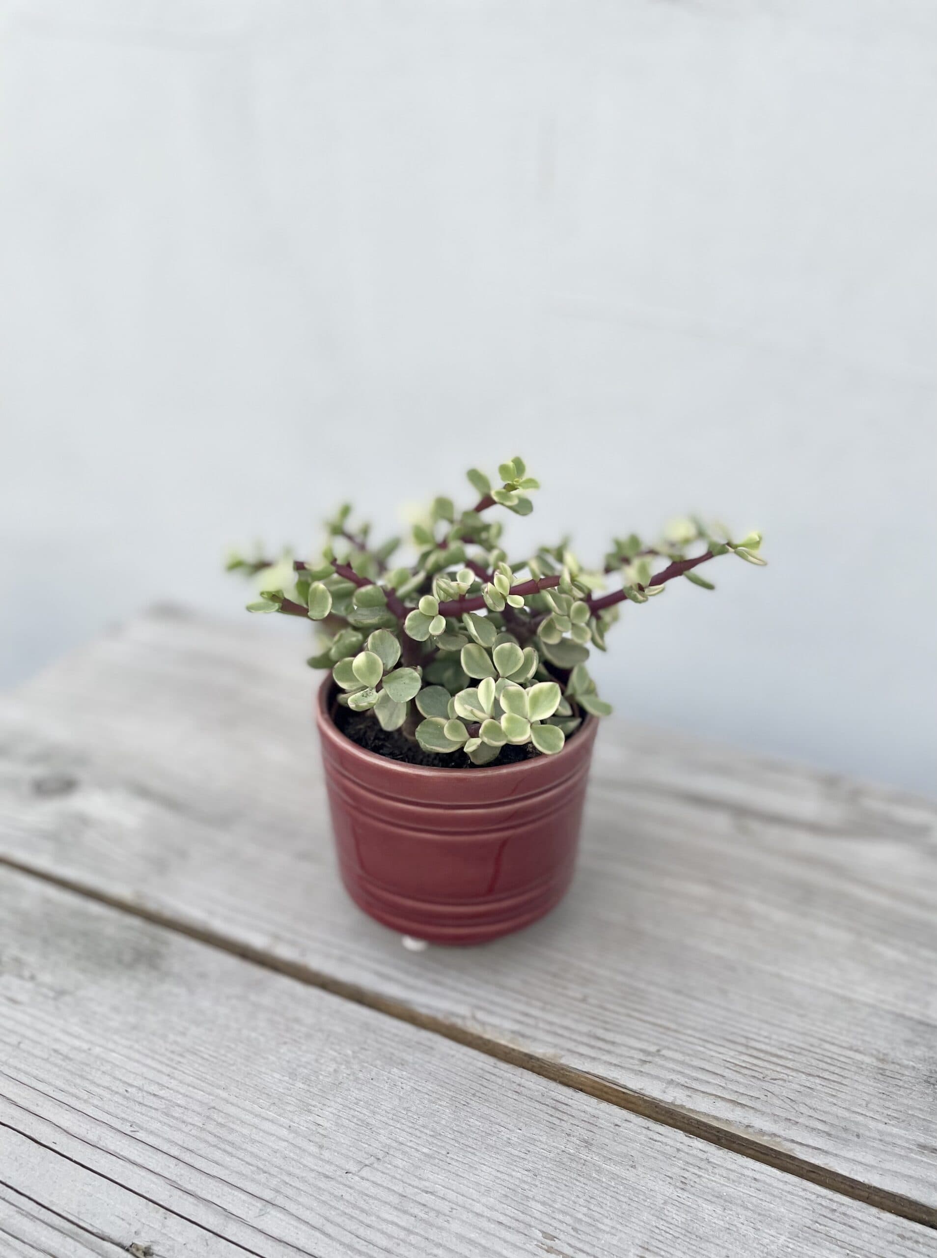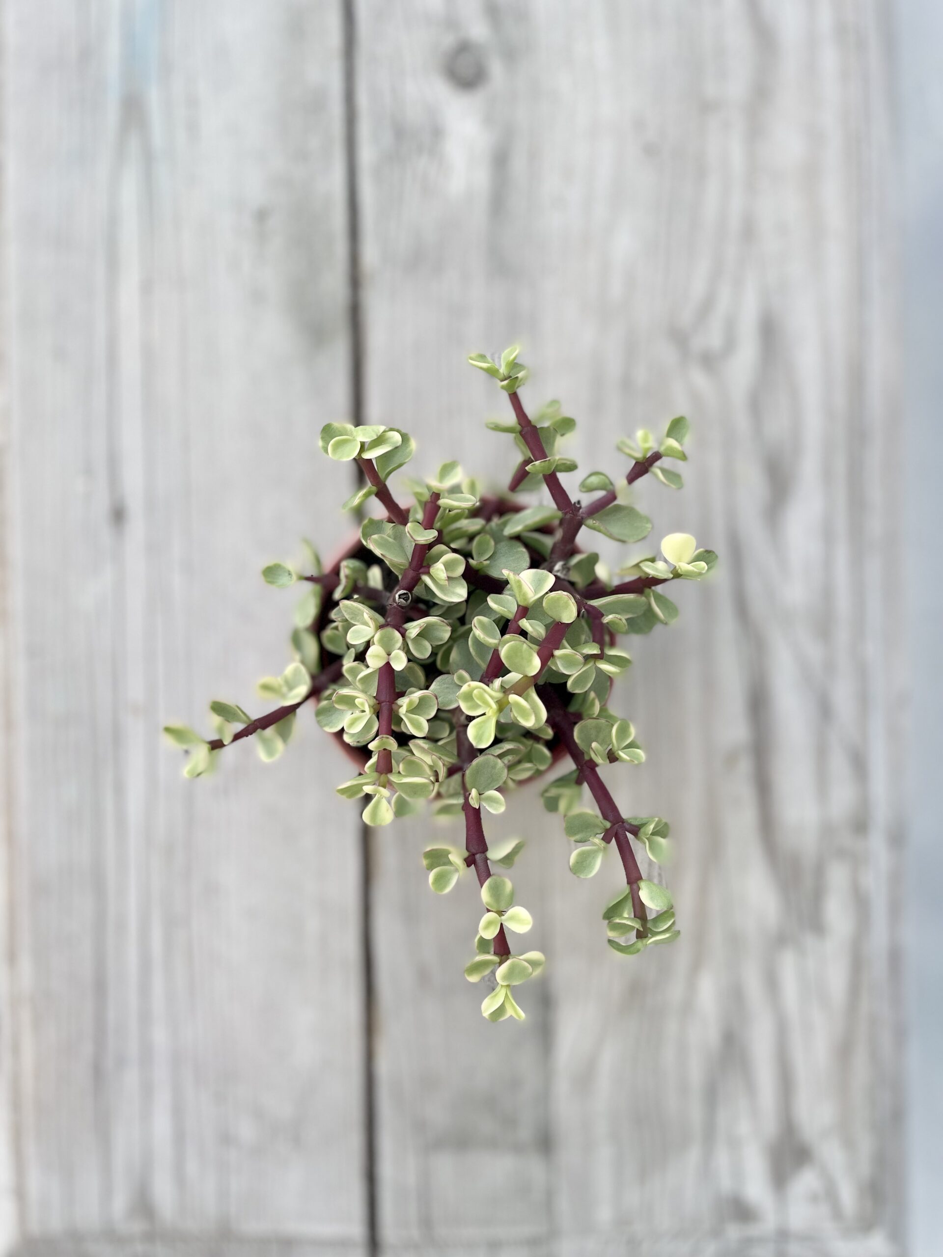 Portulacaria Afra variegata to piękny sukulent, u którego zielono-kremowe mięsiste liście osadzone są na czerwono-brązowych łodygach. Docelowo portulacaria wyrośnie na urokliwą roślinę o krzewiastym pokroju.