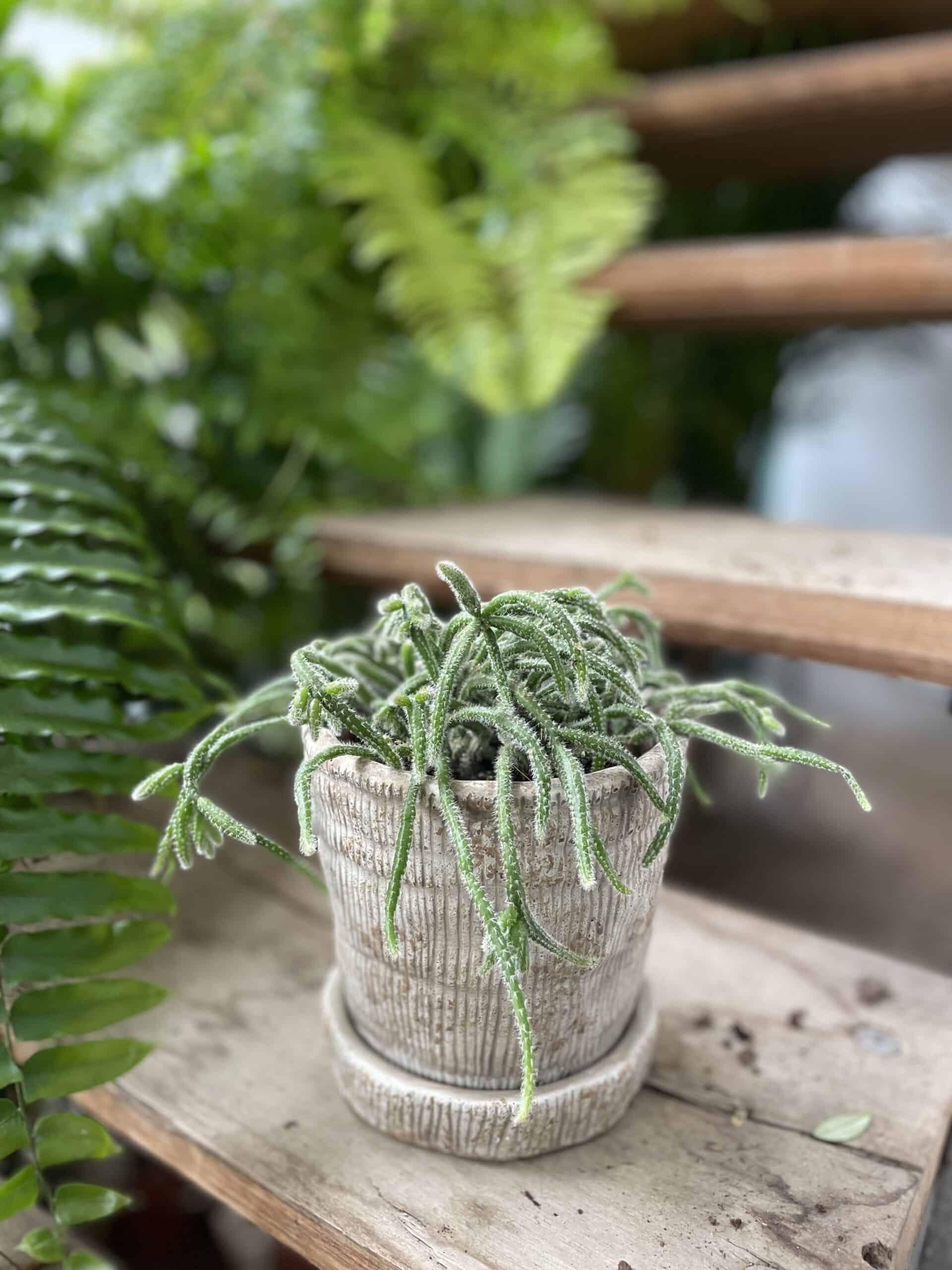 Widoczna na zdjęciu roślina: Rhipsalis baccifera Horrida ma wysokość około 10 cm. Jej doniczka ma 12 cm średnicy oraz 9 cm wysokości.