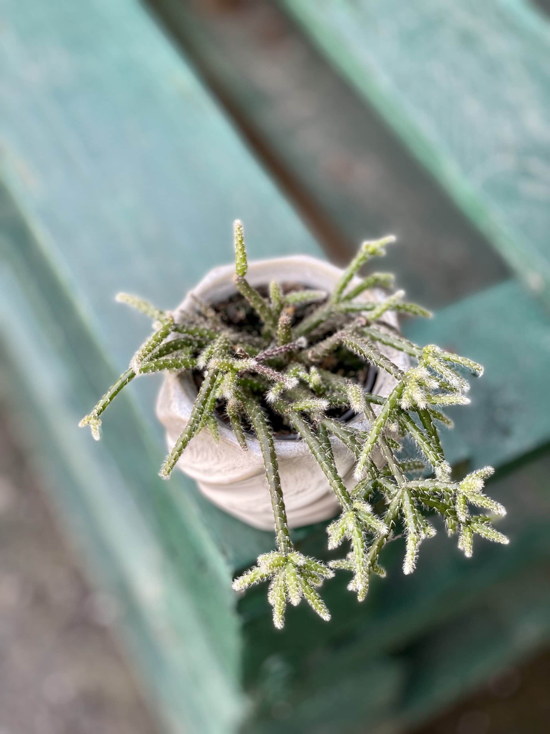 Widoczna na zdjęciu roślina: Rhipsalis pilocarpa ma wysokość około 12 cm. Jej doniczka ma 6 cm średnicy oraz 5 cm wysokości.