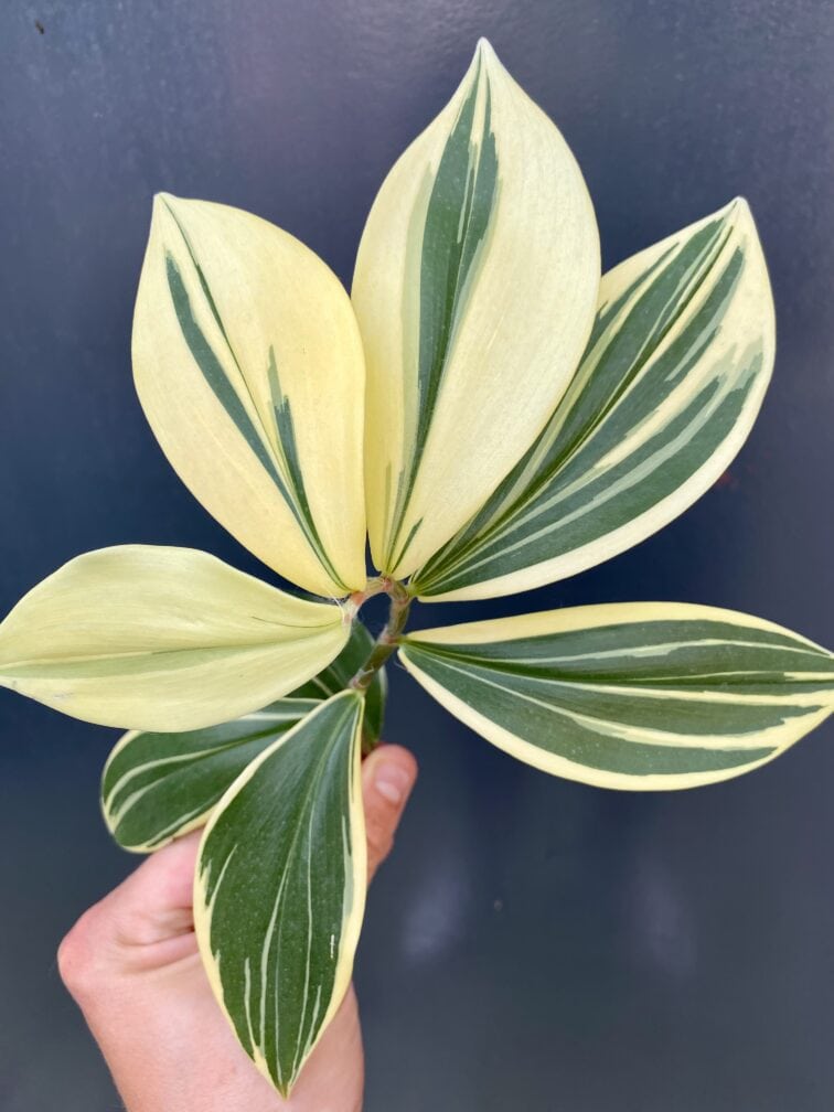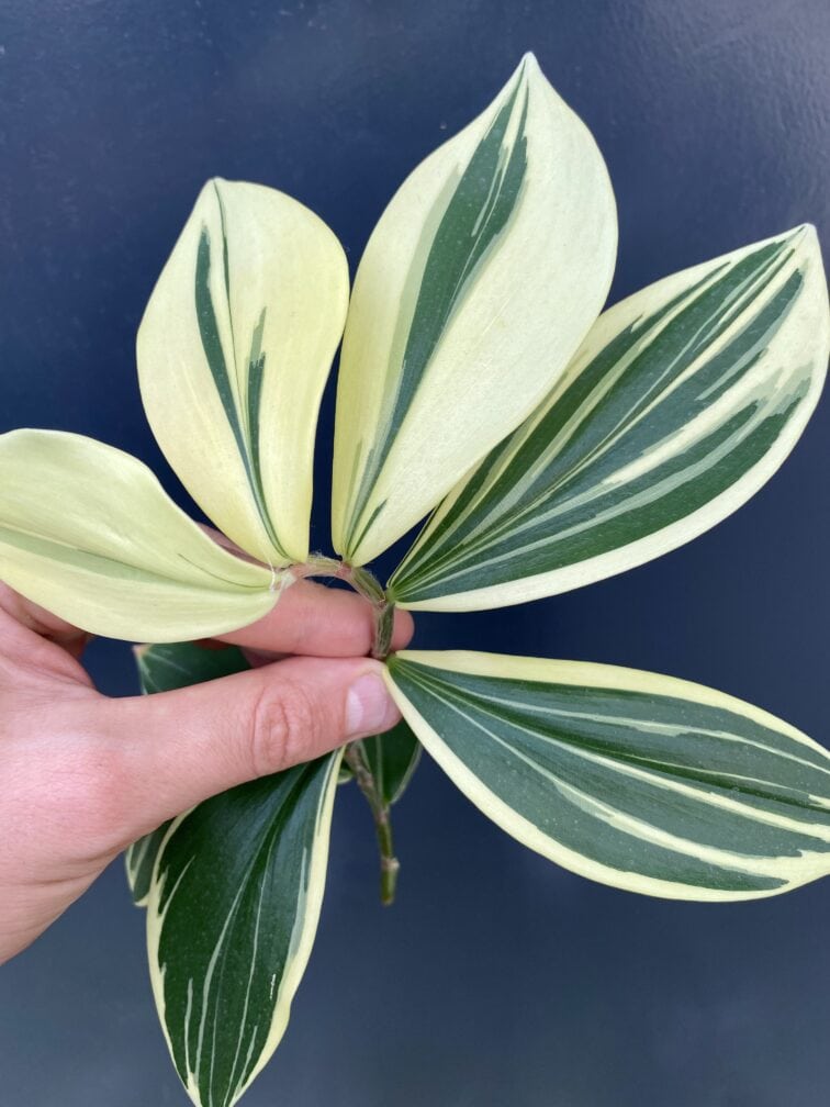 Sadzonka Costusa Arabicus Variegata do samodzielnego ukorzenienia. Ten Costus to bylina z rodziny imbirowatych, o pięknych, dłoniastych liściach, pokrytych wyrazistymi, kremowymi wariegacjami. Sadzonkę polecamy ukorzenić w wodzie z dodatkiem węgla aktywowanego lub w wilgotnym sphagnum. O pielęgnacji już ukorzenionego Costusa Arabicus Variagatus przeczytasz tutaj.