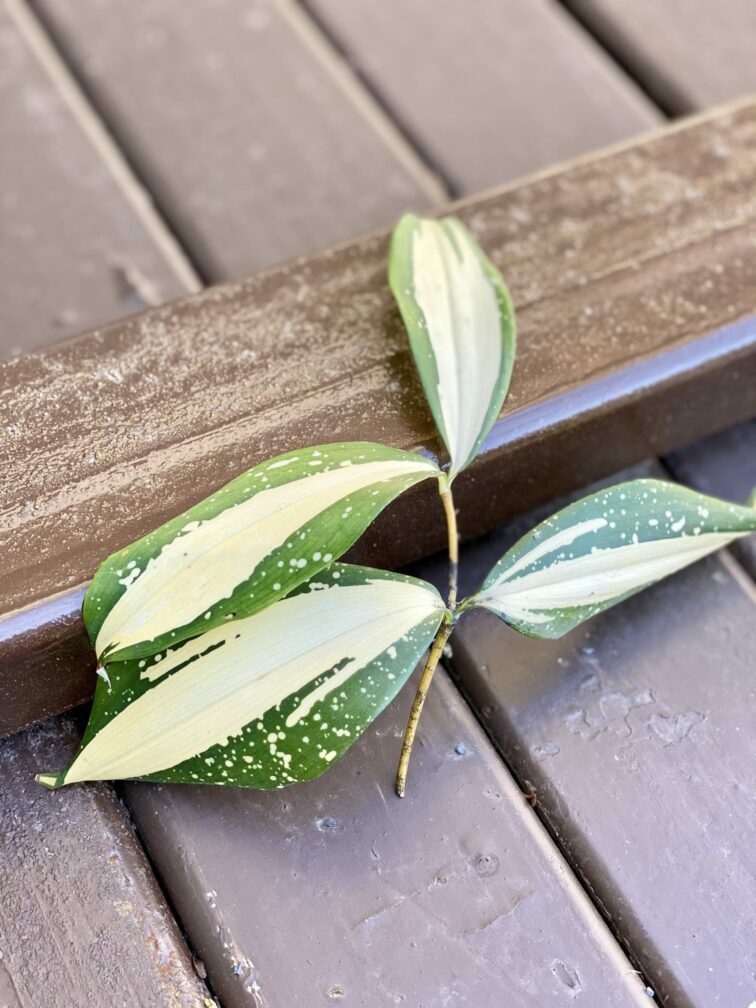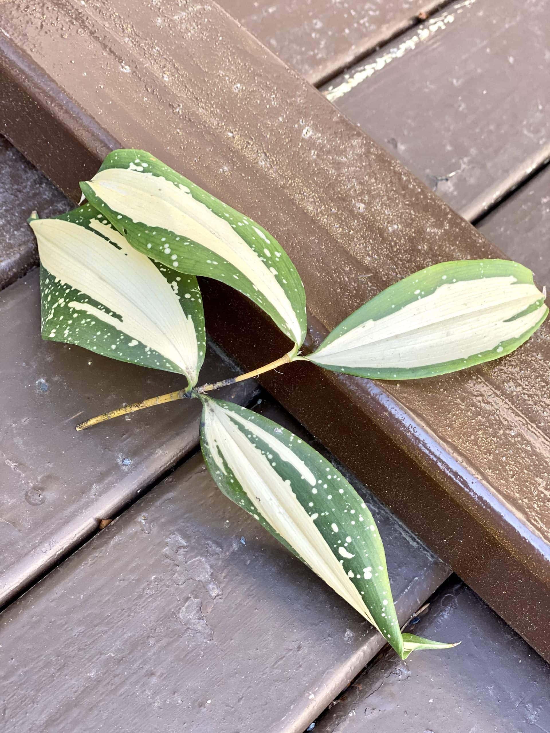 Widoczna na zdjęciu roślina: Sadzonka Dracaena Milky Way 2 ma wysokość około 15 cm. Jej doniczka ma 1 cm średnicy oraz 1 cm wysokości.