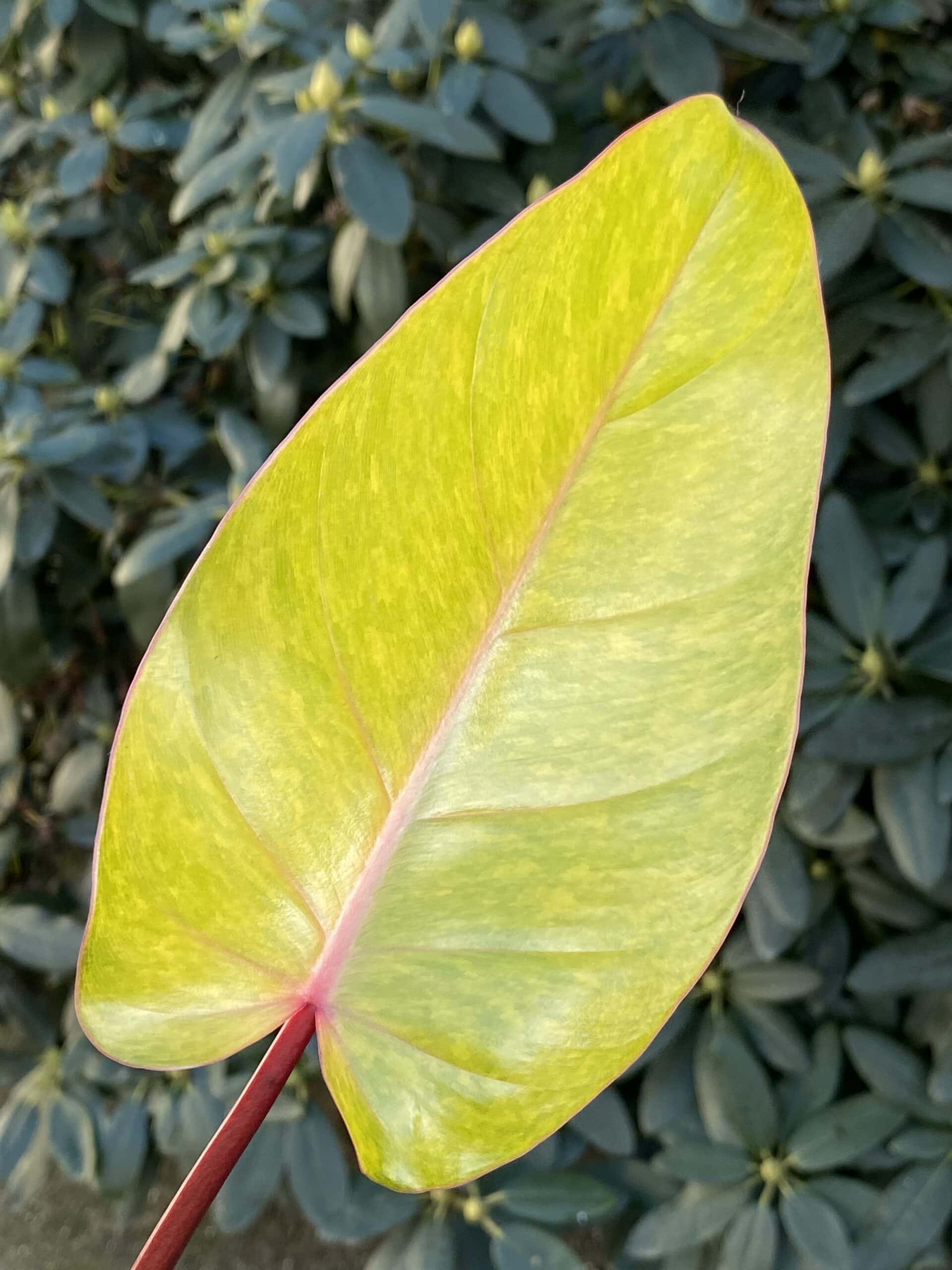 Sadzonka szczytowa filodendrona Painted Lady. Philodendron Painted Lady to kolekcjonerska odmiana filodendrona, o różowych łodygach i liściach, które jak nazwa wskazuje – wyglądają jak namalowane przez znakomitego artystę. Ta piękna dama nie jest bardzo kłopotliwa w uprawie. Warto jednak pamiętać, że żółto-zielona mozaika będzie najwyraźniejsza, kiedy zapewnimy roślinie duże ilości niebezpośredniego światła słonecznego.