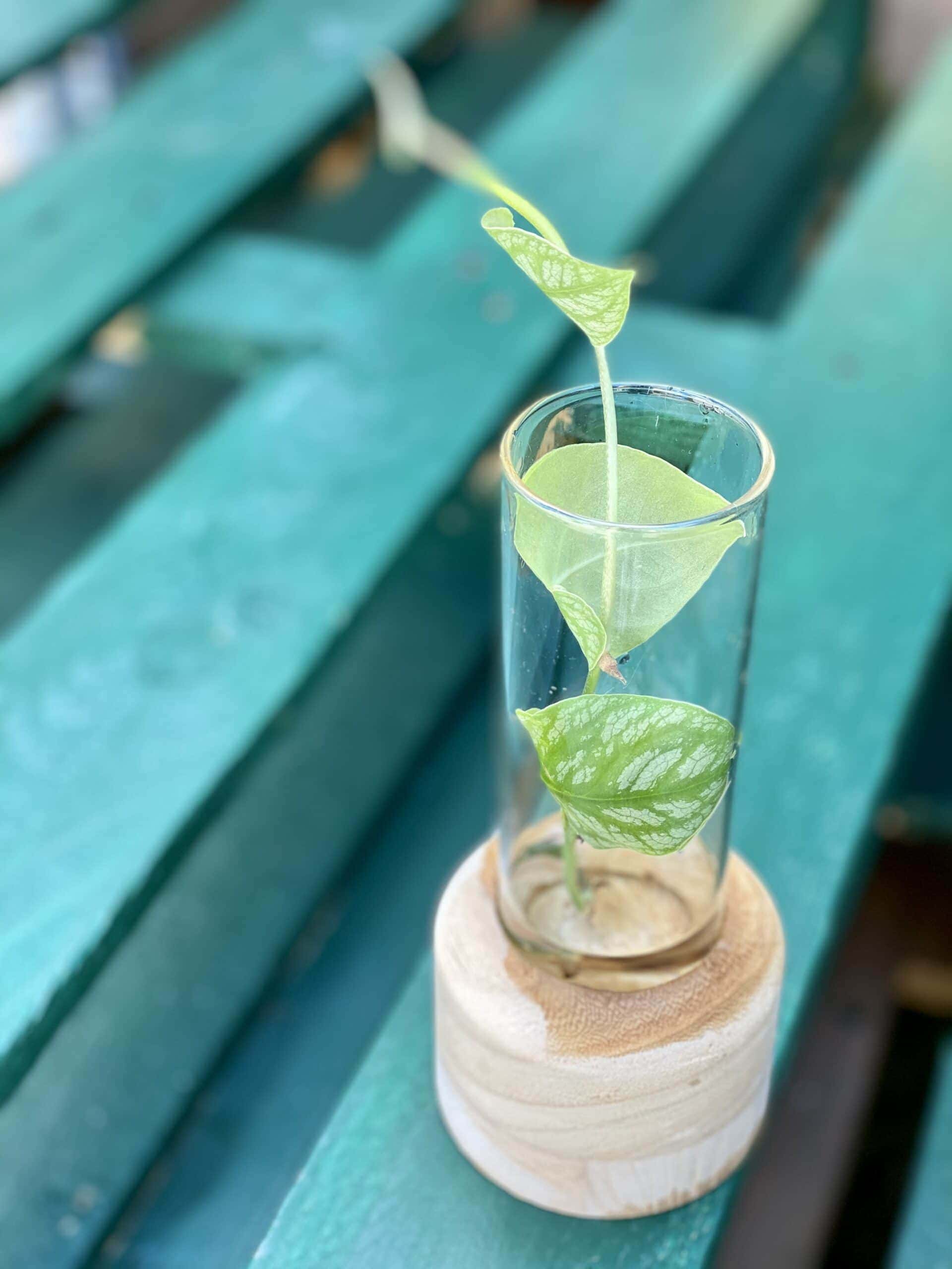 Widoczna na zdjęciu roślina: Sadzonka Monstera Dubia ma wysokość około 17 cm. Jej doniczka ma 1 cm średnicy oraz 1 cm wysokości.