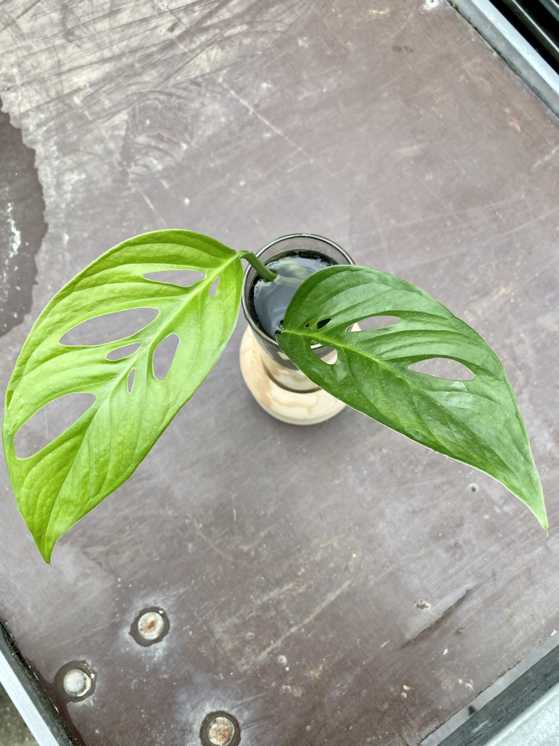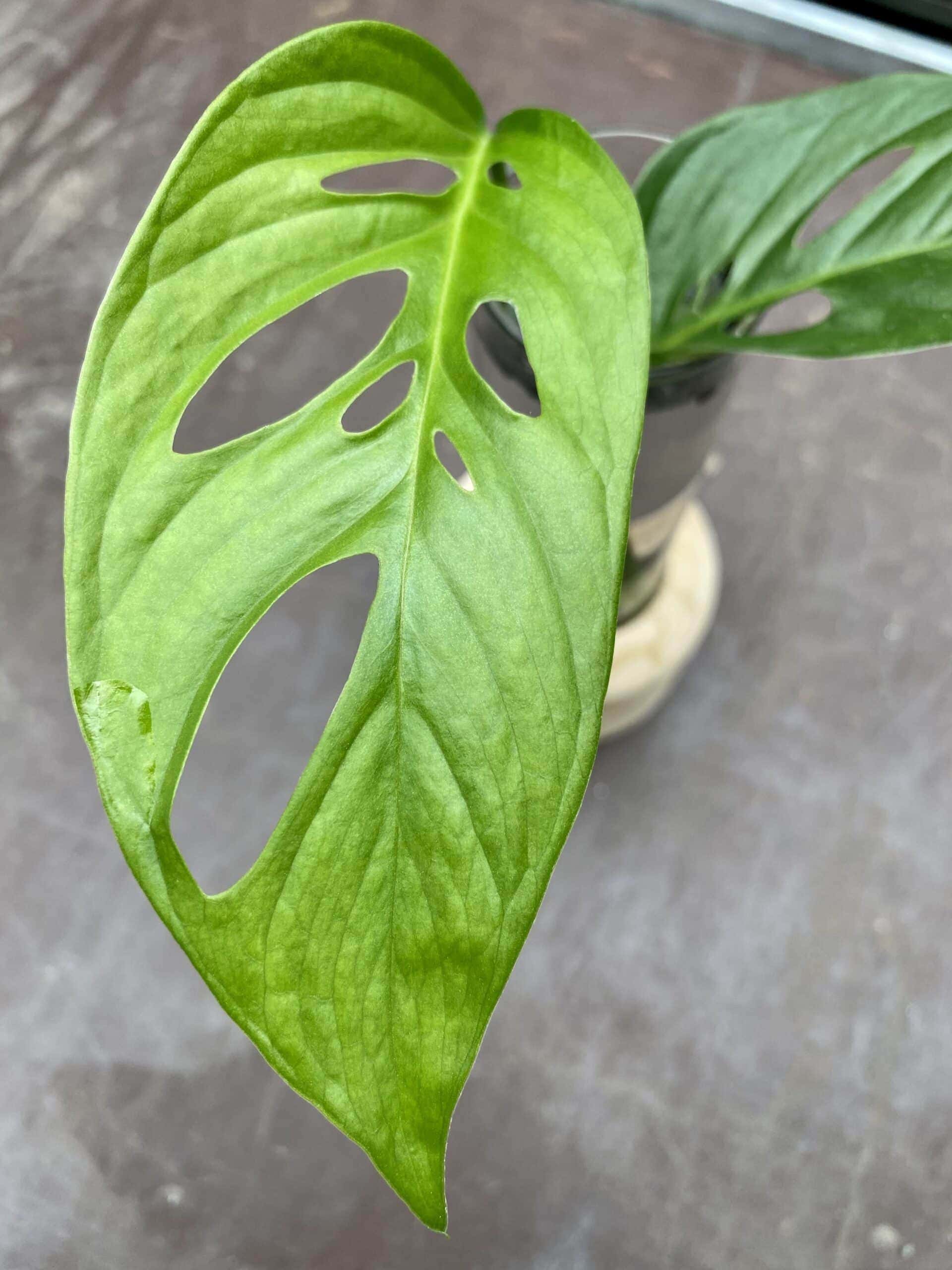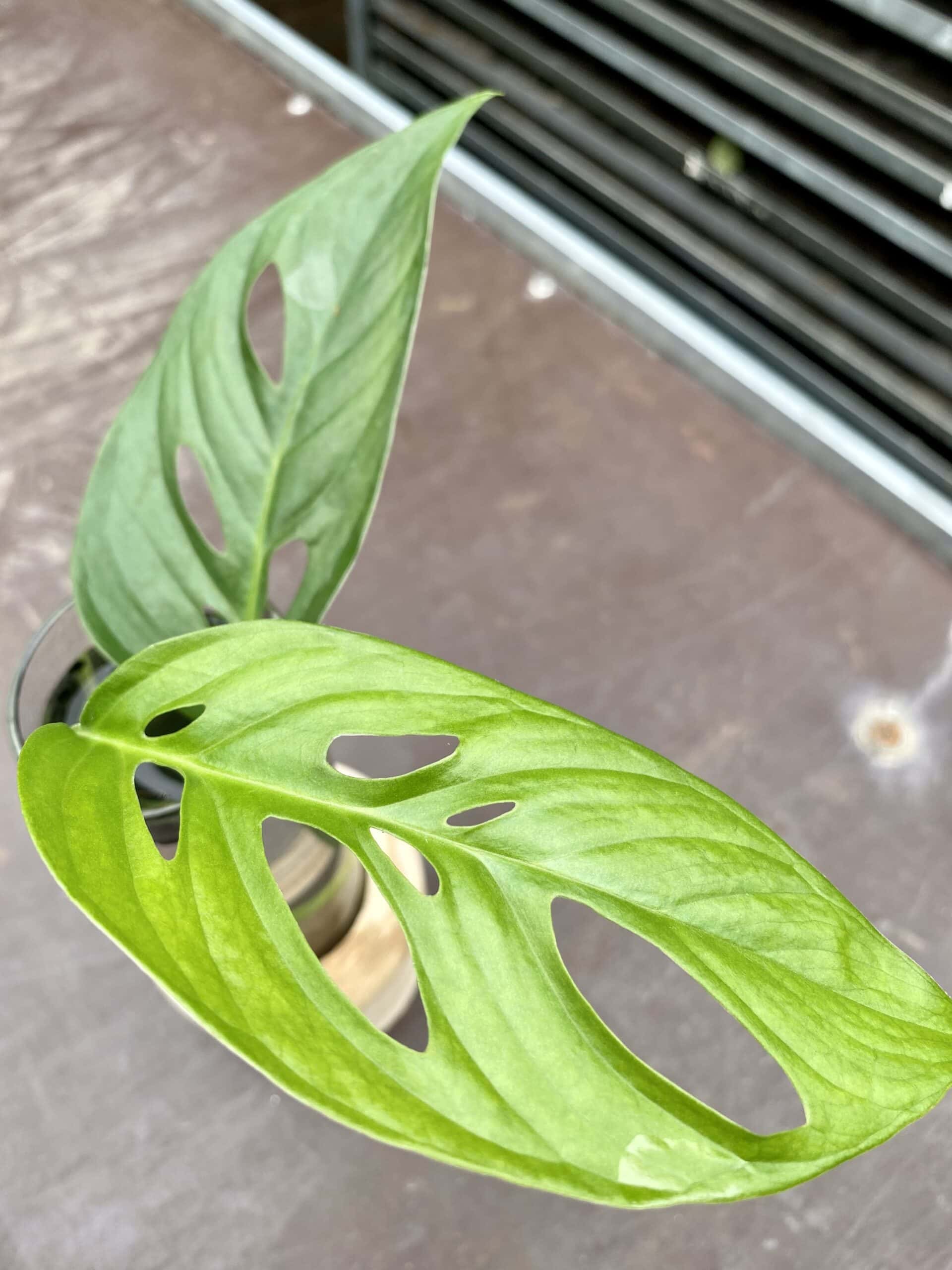 Widoczna na zdjęciu roślina: Sadzonka Monstera laniata ma wysokość około 10 cm. Jej doniczka ma 1 cm średnicy oraz 1 cm wysokości.
