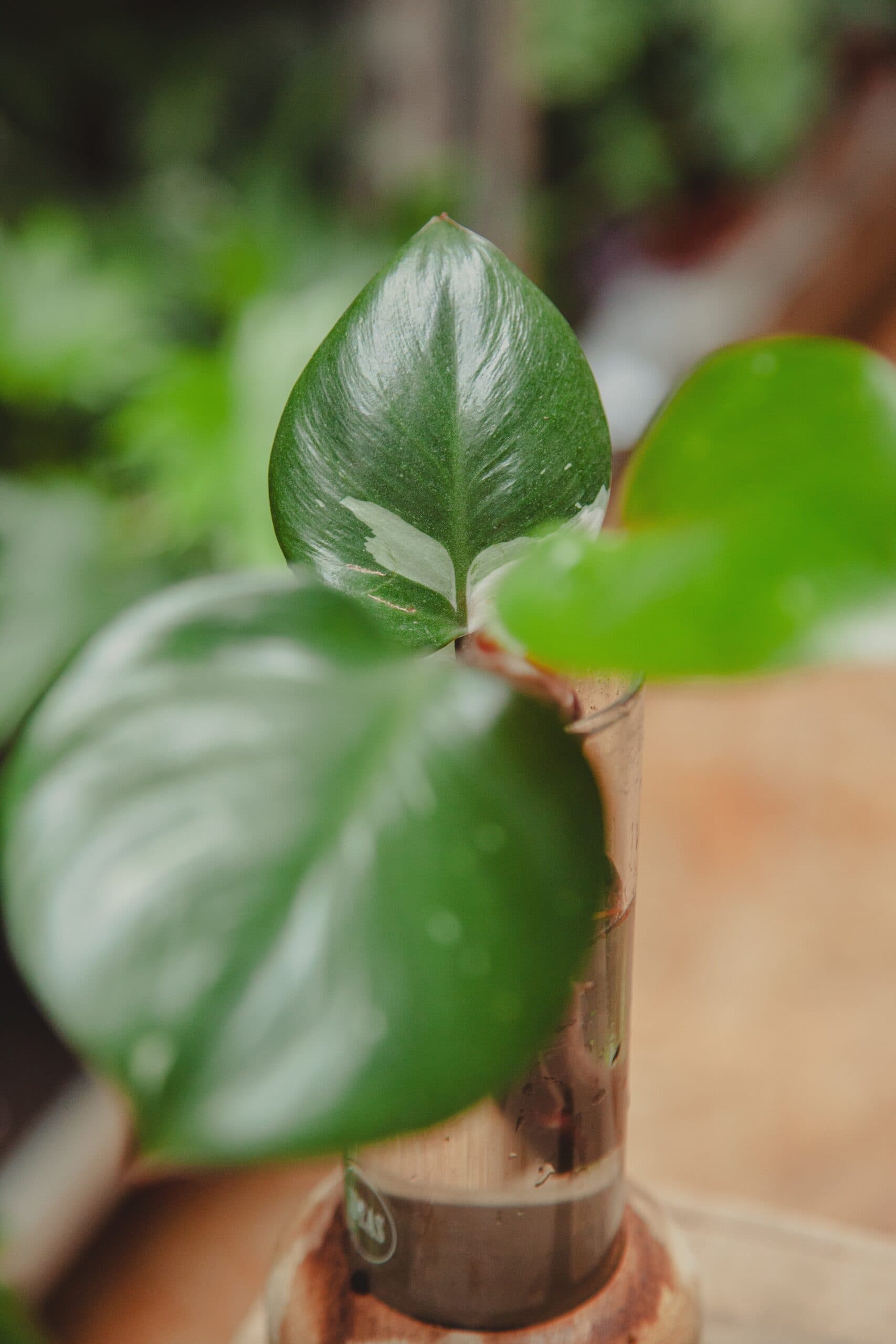 Widoczna na zdjęciu roślina: Sadzonka Philodendron White Knight ma wysokość około 20 cm. Jej doniczka ma 1 cm średnicy oraz 1 cm wysokości.