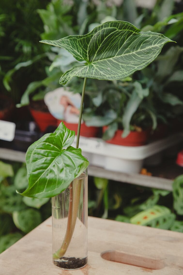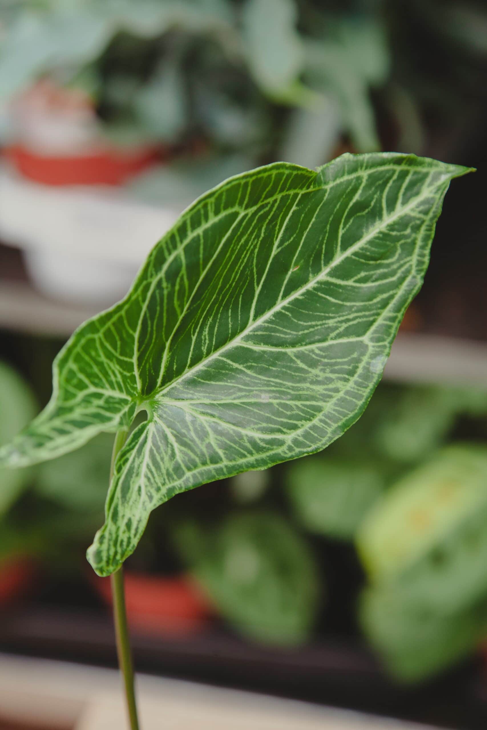 Widoczna na zdjęciu roślina: Sadzonka Syngonium Batik ma wysokość około 35 cm. Jej doniczka ma 1 cm średnicy oraz 1 cm wysokości.