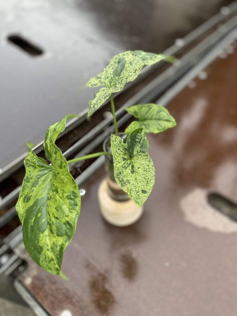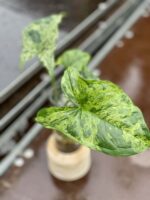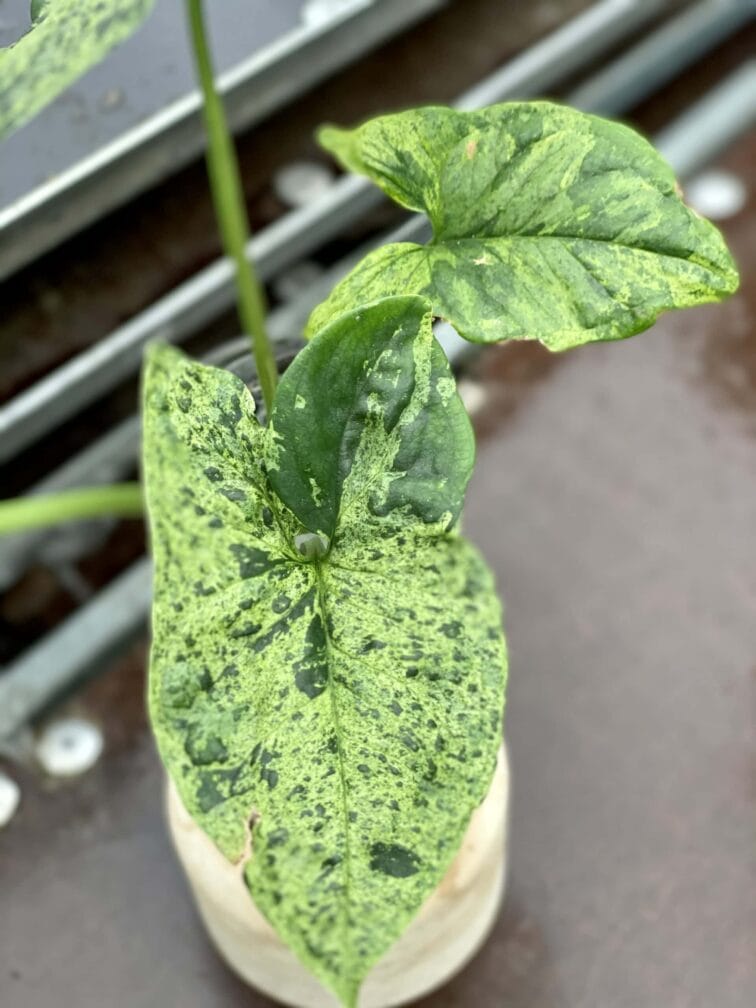 Widoczna na zdjęciu roślina: Sadzonka Syngonium Mottled ma wysokość około 20 cm. Jej doniczka ma 1 cm średnicy oraz 1 cm wysokości.