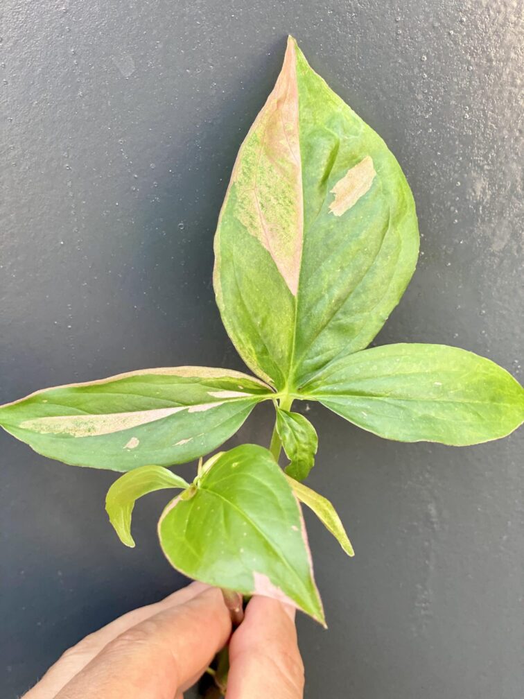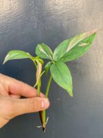 Sadzonka Syngonium Pink Splash – kolekcjonerskiego syngonium muśniętego różem! Sadzonkę polecamy ukorzenić w wodzie z dodatkiem węgla aktywowanego lub w wilgotnym sphagnum. O pielęgnacji już ukorzenionego Syngonium Pink Splash przeczytasz tutaj.